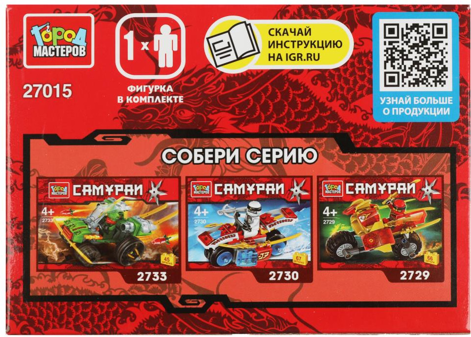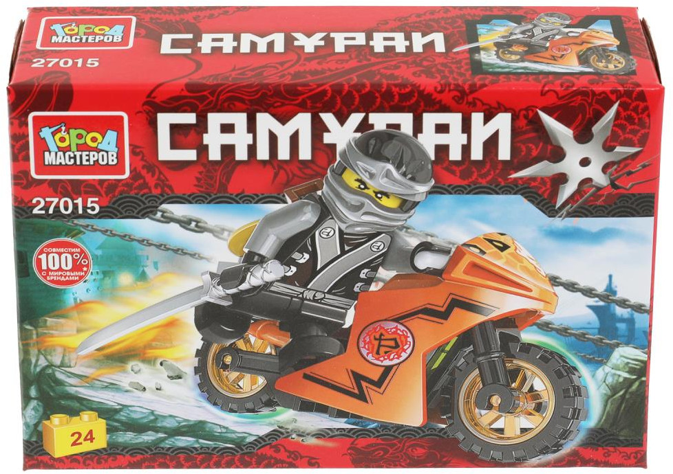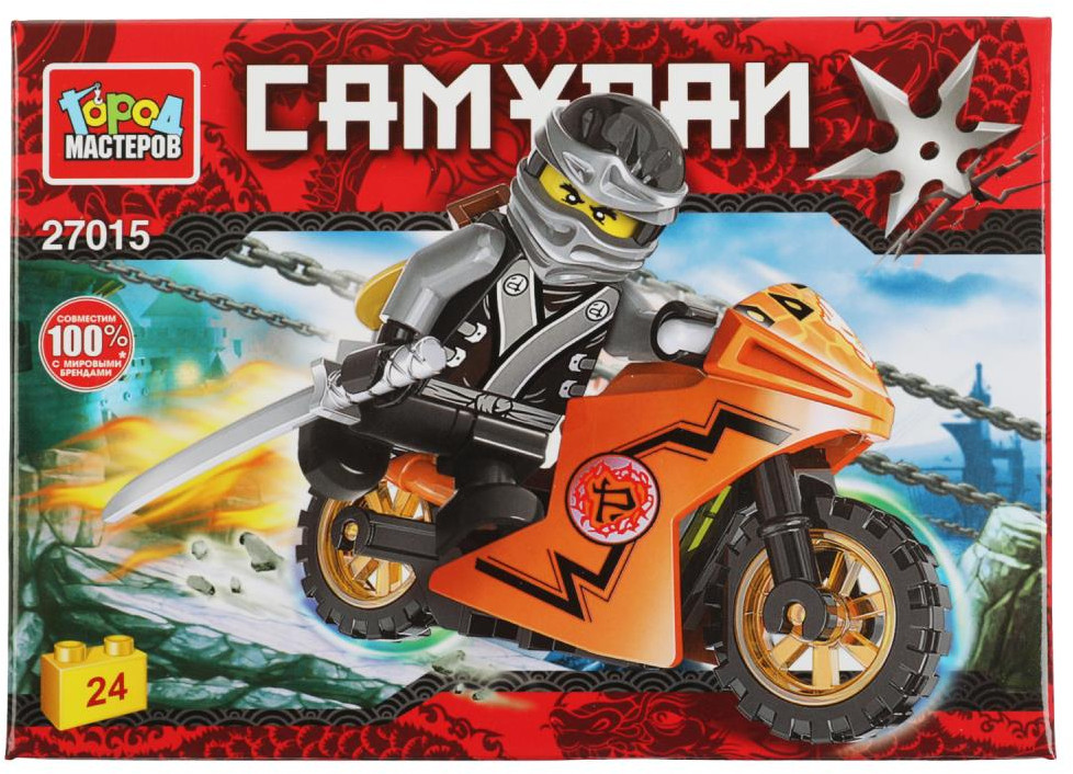 С помощью этого занимательного конструктора можно собрать яркий байк для храброго самурая и вместе с ним отправиться на поиски приключений. Набор вдохновит ребёнка на новые увлекательные сюжеты для игр и станет гордостью его игрушечной коллекции. Собирая конструктор ТМ «Город мастеров», ребёнок будет развивать: мелкую моторику, мышление, внимание, усидчивость, логику. Конструктор «Чёрный самурай на мотоцикле» из серии «Самураи» станет прекрасным подарком для маленького фантазёра.