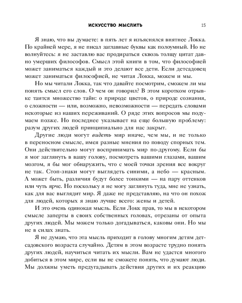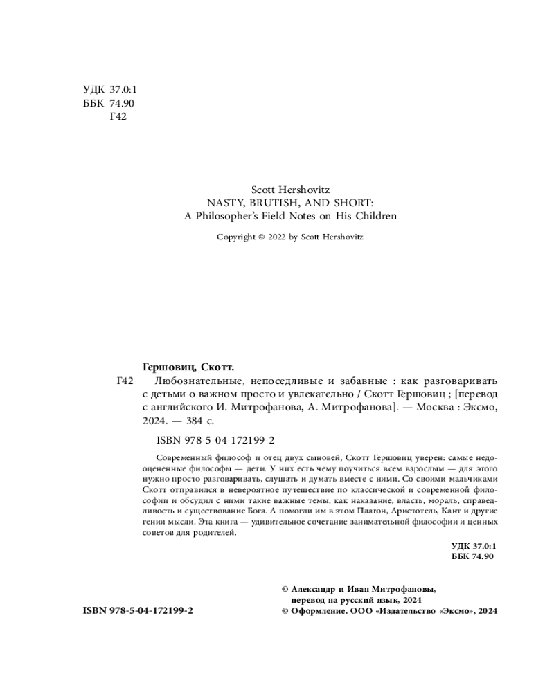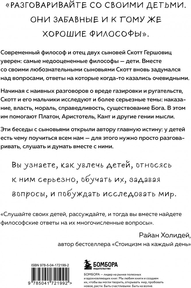 Серия: Интересно о воспитании. Удивительные факты о наших детях Эта книга — удивительное сочетание занимательной философии и ценных советов для родителей и педагогов. Вы узнаете, как увлечь детей, относясь к ним серьезно, обучать их, задавая вопросы, и побуждать исследовать мир. Современный философ и отец двух сыновей Скотт Гершовиц уверен: самые недооцененные философы — дети. Со своими любознательными мальчиками он вновь задумался над вопросами, ответы на которые когда-то казались очевидными. Вместе они обсудили такие важные философские темы, как наказание, власть, мораль, справедливость, существование Бога. А помогли им в этом Платон, Аристотель, Кант и другие гении мысли. Эти беседы открыли автору главную истину: у детей есть чему поучиться всем взрослым — для этого нужно просто разговаривать, слушать и думать вместе с ними. |