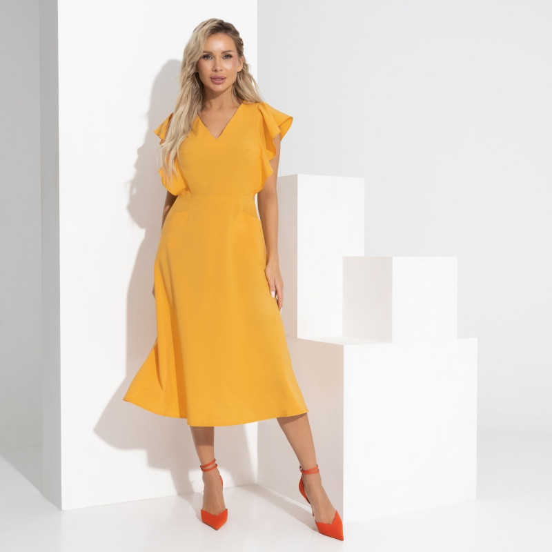 Соответствует описанию, цвет ближе к горчичному. Платье без подклада, ткань тонкая, но не прсвечивает. Пошив аккуратный, с изнанки нет торчащих ниток.