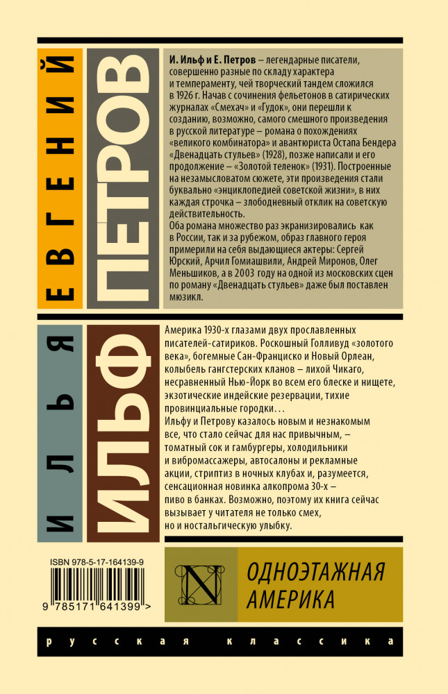 💳 Оплатить за товар можно при получении 🇰🇿 Есть бесплатная доставка по Казахстану 🎁 Копите бонусы с каждой покупки Серия: Эксклюзивная классика (Лучшее) Америка 1930-х глазами двух прославленных писателей-сатириков. Роскошный Голливуд «золотого века», богемные Сан-Франциско и Новый Орлеан, колыбель гангстерских кланов — лихой Чикаго, несравненный Нью-Йорк во всем его блеске и нищете, экзотические индейские резервации, тихие провинциальные городки... Ильфу и Петрову казалось новым и незнакомым все, что стало сейчас для нас привычным, — томатный сок и гамбургеры, холодильники и вибромассажеры, автосалоны и рекламные акции, стриптиз в ночных клубах и, разумеется, сенсационная новинка алкопрома 30-х — пиво в банках. Возможно, поэтому их книга сейчас вызывает у читателя не только смех, но и ностальгическую улыбку. |
