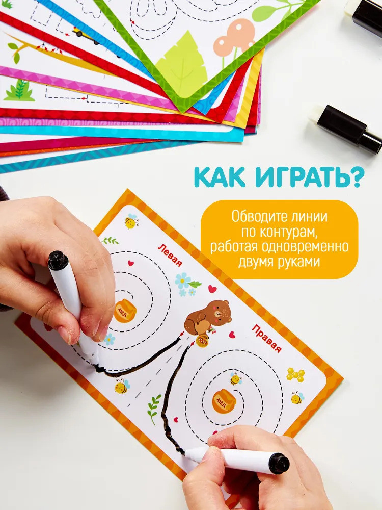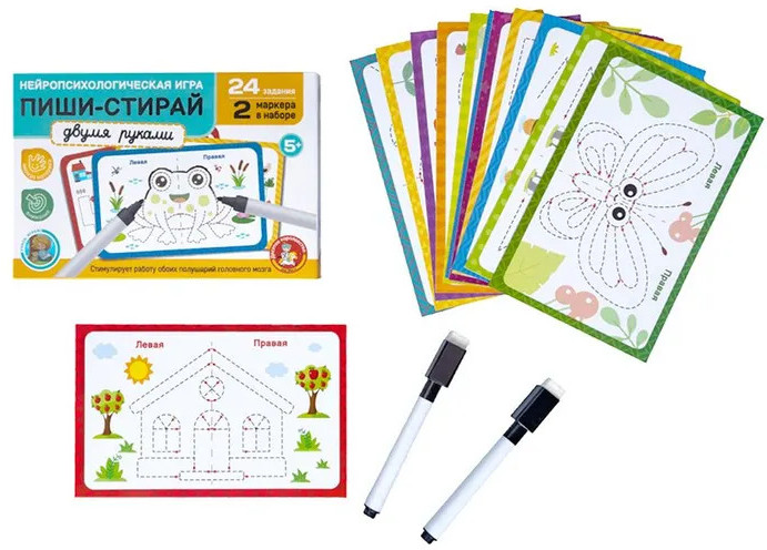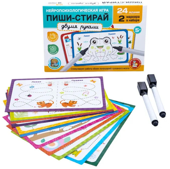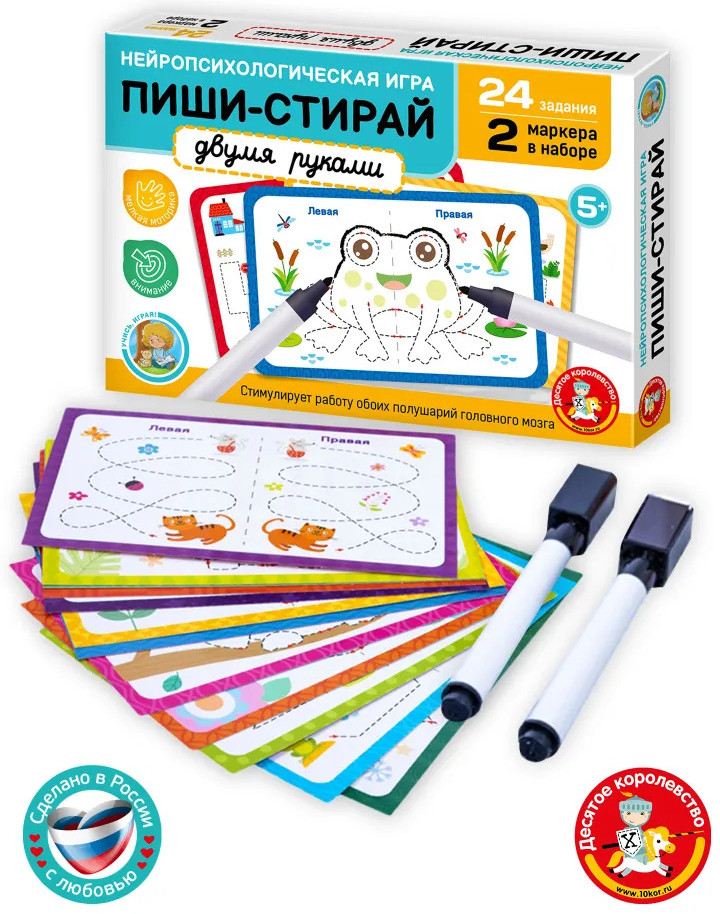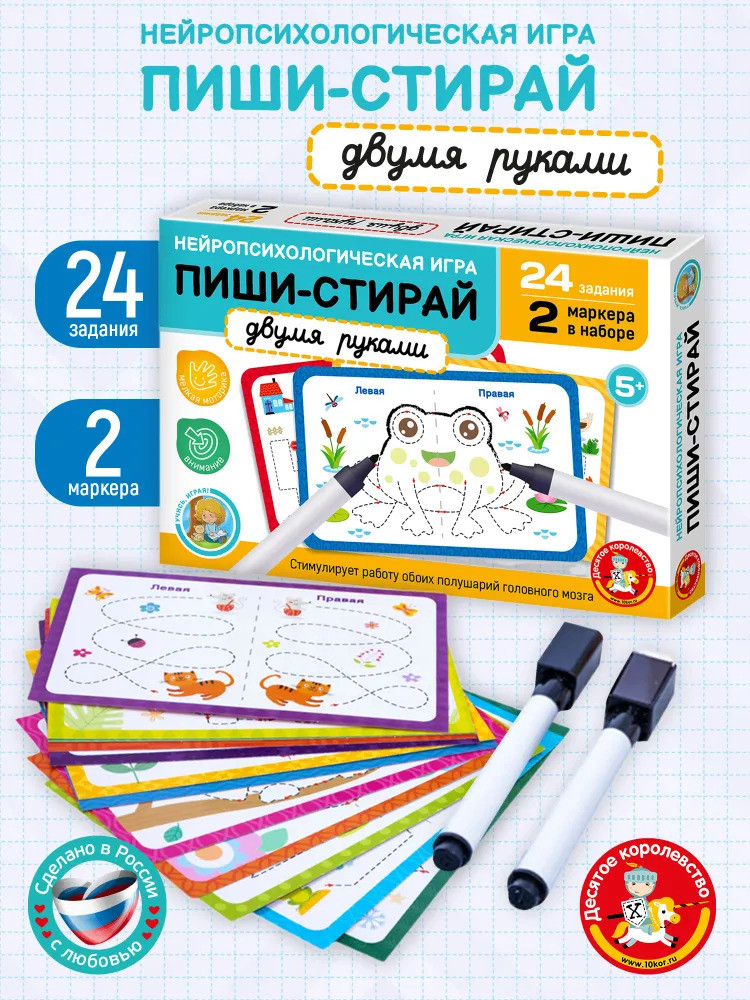 Десятое королевство Игра развивающая «Двумя руками»В данный момент этот товар отсутствует в продаже. Возможно, у нас найдется аналогичный или похожий товар здесь. Серия: Учись, играя Развивающая игра для детей «Двумя руками» серии Пиши-Стирай - это набор карточек с заданиями, выполнить которые игрок должен двумя руками одновременно! Благодаря специальному покрытию карточки можно использовать многократно, т.к. маркер легко стирается. Выполнение упражнений в игре «Двумя руками» Пиши-Стирай развивает моторику и творческие навыки, внимание, воображение и логическое мышление. |