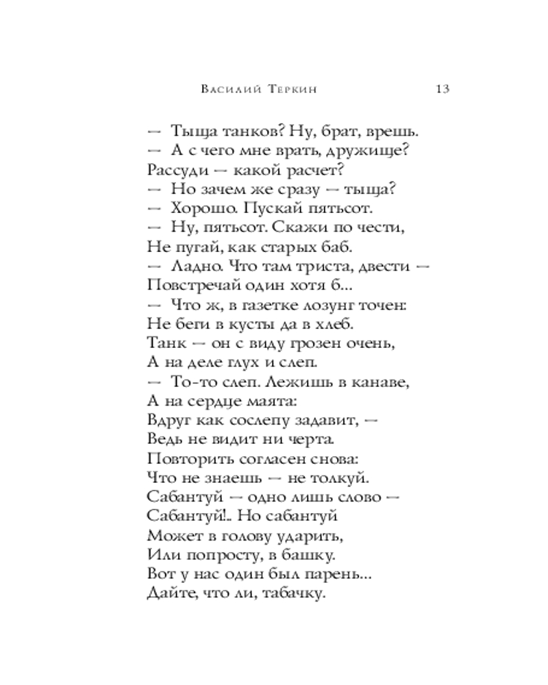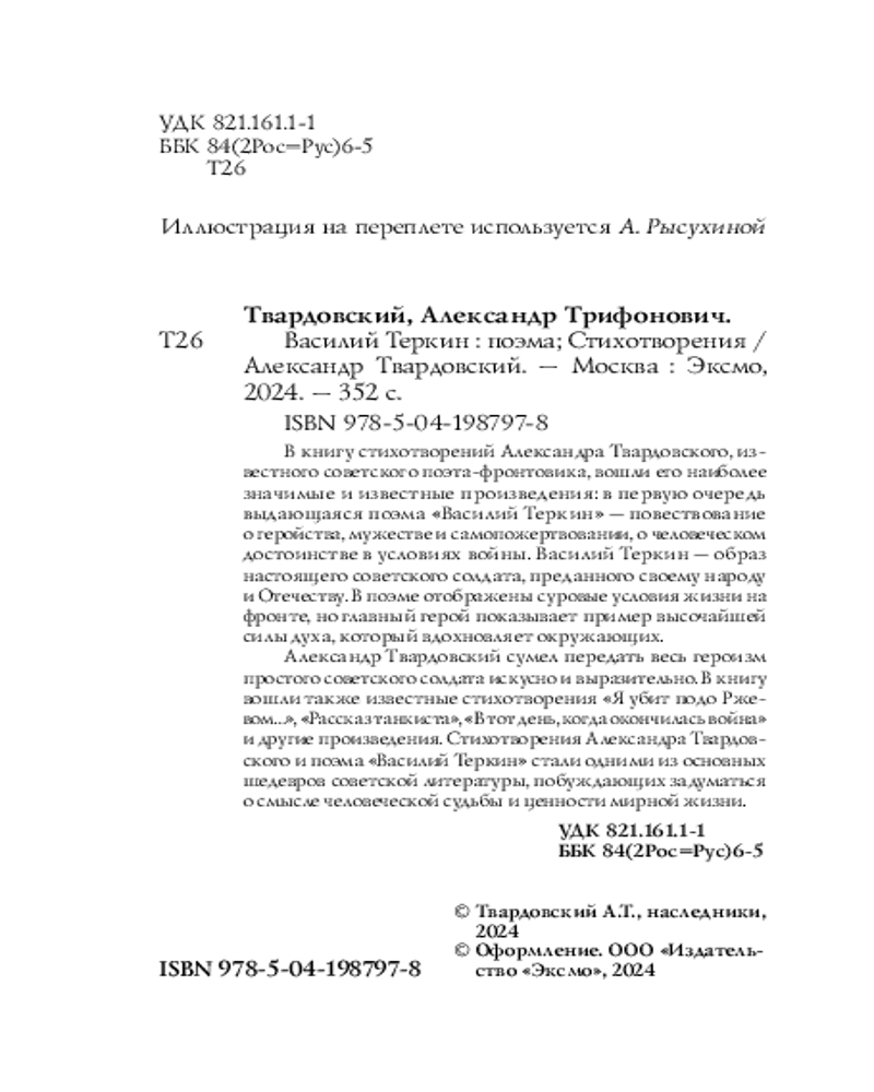 Василий Теркин. СтихотворенияАлександр Трифонович Твардовский В данный момент этот товар отсутствует в продаже. Возможно, у нас найдется аналогичный или похожий товар здесь. Серия: Собрание больших поэтов В книгу стихотворений Александра Твардовского, известного советского поэта-фронтовика, вошли его наиболее значимые и известные произведения: в первую очередь, выдающаяся поэма «Василий Тёркин» — повествование о геройстве, мужестве и самопожертвовании, о человеческом достоинстве в условиях войны. Василий Тёркин — образ настоящего советского солдата, преданного своему народу и Отечеству. В поэме отображены суровые условия жизни на фронте, но главный герой показывает пример высочайшей силы духа, который вдохновляет окружающих. |