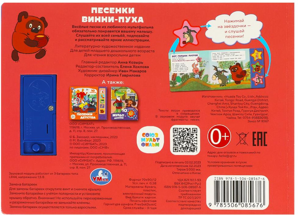 💳 Оплатить за товар можно при получении 🇰🇿 Есть бесплатная доставка по Казахстану 🎁 Копите бонусы с каждой покупки Серия: 3 звезды 3 песни Музыкальная книга «Песенки Винни-Пуха» ТМ «УМка» станет прекрасным подарком для малыша. Ребёнок с удовольствием будет листать плотные страницы, рассматривать яркие картинки и, конечно, нажимать на кнопки и слушать песенки из популярного мультфильма про забавного медвежонка Винни-Пуха и его друзей. Малыш легко освоит включение звука: по нажатию на кнопку песенка включится, при втором нажатии выключится. Благодаря компактному размеру книгу удобно взять с собой в дорогу. Рекомендовано детям младшего дошкольного возраста. |