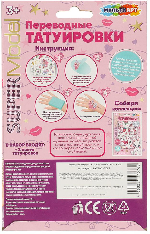 💳 Оплатить за товар можно при получении 🇰🇿 Есть бесплатная доставка по Казахстану 🎁 Копите бонусы с каждой покупки Переводные татуировки «Феи» ТМ «Мульти Арт» — эффектное украшение для тела! При помощи этого набора можно примерить на себя стильный образ. Тату легко наносятся и смываются, безопасны для детей, а главное, их можно менять. |