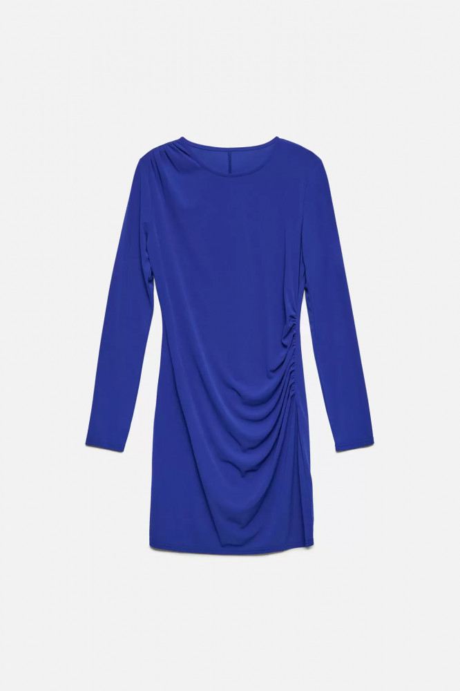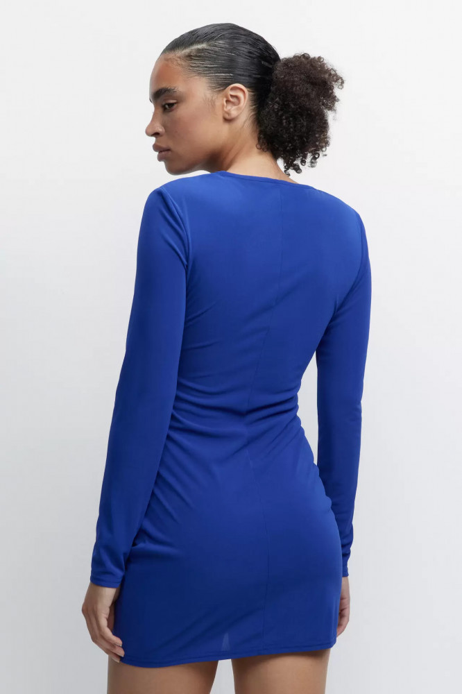 Платье-футляр мини облегающее с драпировкой по бокам. короткое платье-футляр мини облегающего кроя из мягкой, приятной к телу ткани с гладкой фактурой. Вырез горловины лодочка, длинные облегающие рукава с прямыми манжетами, короткая прямая юбка со слегка завышенной линией талии и драпировкой по бокам. Без застежки, без карманов. Яркий синий цвет платья-футляра поможет привлечь взгляды на вечеринках.
