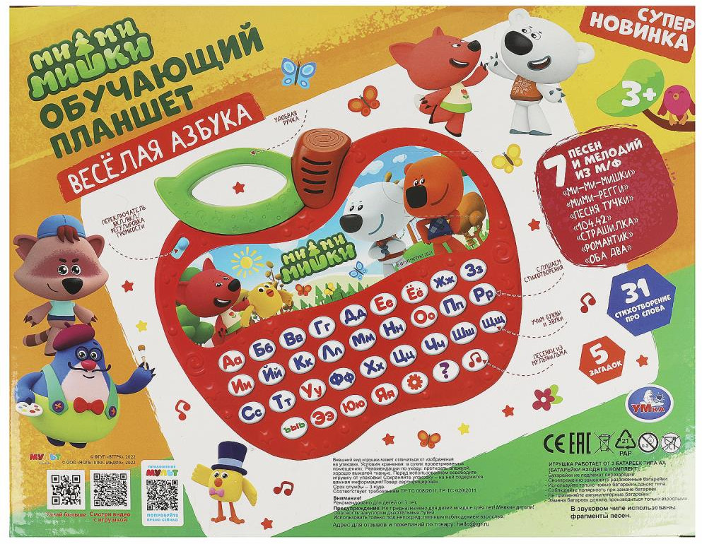 Серия: Ми-Ми-мишки Обучающий планшет «Ми-ми-мишки. Весёлая азбука» ТМ «УМка» станет прекрасным подарком для маленьких поклонников мультсериала про весёлых медвежат и их друзей. Игрушка-планшет — креативный и полезный подарок для развития и игры. Такой планшет поможет ребёнку быстро и эффективно выучить азбуку и звуки. Малыш с удовольствием будет нажимать на кнопки и слушать песни и стихи, а также отгадывать загадки. |
