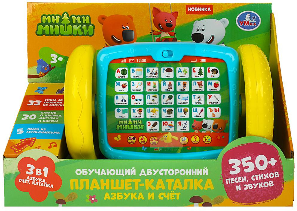 Серия: Ми-Ми-мишки Обучающий двусторонний планшет-каталка «Ми-ми-мишки» ТМ «УМка» станет прекрасным подарком для маленьких поклонников мультсериала про весёлых медвежат и их друзей.Этот оригинальный планшет непременно понравится вашему ребёнку. Нажимая на яркие кнопки малыш познакомится с цифрами, цветами, буквами, и словами. Ребёнок с удовольствием будет слушать интересные стихи и песни из любимого мультсериала. А благодаря колёсикам, с планшетом можно играть как с каталкой. |