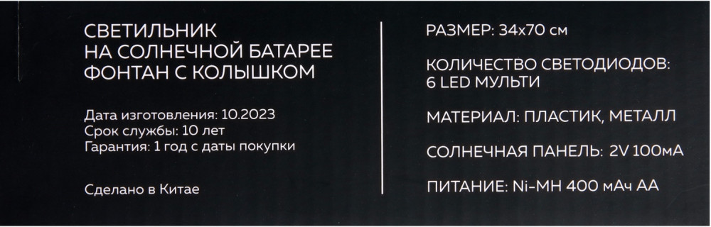 Солнечная панель: 2Ѵ 100мА. Питание: Ni-MH 400 мАч АА.