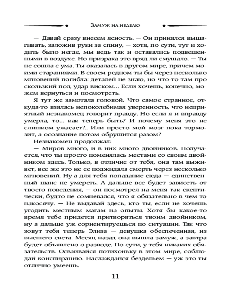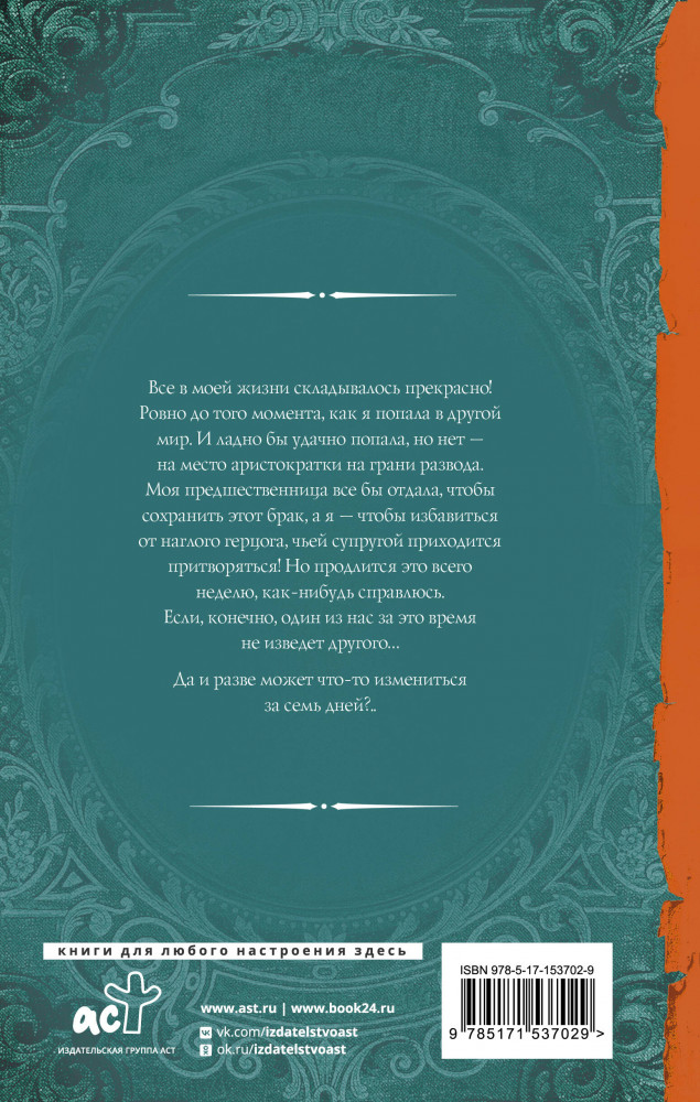 Серия: Необыкновенная магия. Шедевры Рунета Все в моей жизни складывалось прекрасно! Ровно до того момента, как я попала в другой мир. И ладно бы удачно попала, но нет — на место аристократки на грани развода. Моя предшественница все бы отдала, чтобы сохранить этот брак, а я — чтобы избавиться от наглого герцога, чьей супругой приходится притворяться! Но продлится это всего неделю, как-нибудь справлюсь. Если, конечно, один из нас за это время не изведет другого... Да и разве может что-то измениться за семь дней?.. |