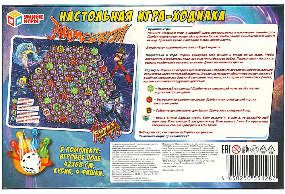 Настольная игра-ходилка «Аниме баттл» ТМ «Умные игры» — захватывающее приключение в стиле аниме! Примите участие в игре, в которой шары превращаются в магических анимонстров. Пройдите до финиша и одолейте врагов в битвах, чтобы помочь анимонстрам защитить их мир. Бросайте кубик и победите в этом Аниме Баттле!
