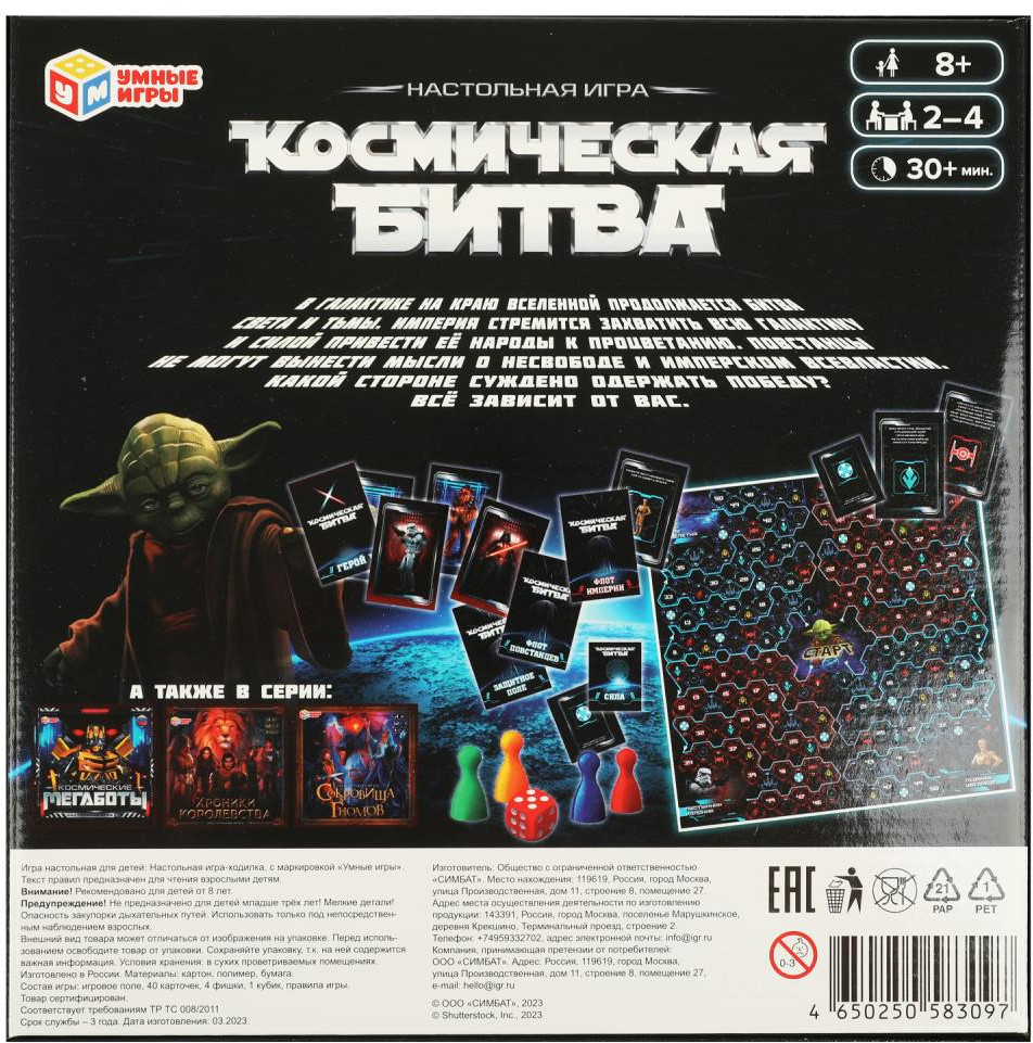 Умные игры Игра-ходилка настольная «Космическая битва»В данный момент этот товар отсутствует в продаже. Возможно, у нас найдется аналогичный или похожий товар здесь. В галактике на краю вселенной продолжается вечная битва Света и Тьмы... Империя стремится захватить всю галактику и силой привести её народы к «процветанию». Повстанцы не могут вынести мысли о несвободе и имперском всевластии. Бросайте кубик, выбирайте сторону и скорее отправляйтесь в свой Штаб. Уходите от погони, уворачивайтесь от выстрелов из космических бластеров и наносите ответный удар! Перемещайтесь по игровому полю и выполняйте задания, собирайте жетоны союзников и сражайтесь с противником. Победит тот игрок, кто первым доберется до Штаба, не потеряв своего героя. Какой стороне суждено одержать победу? Всё зависит только от вас. |