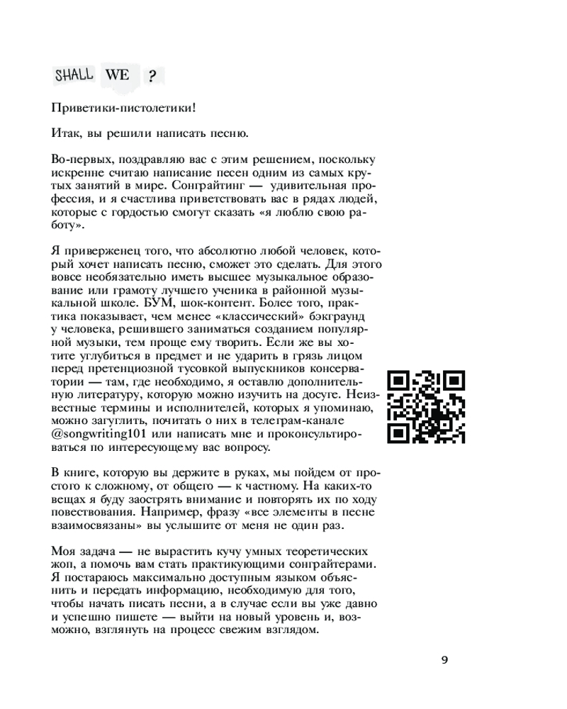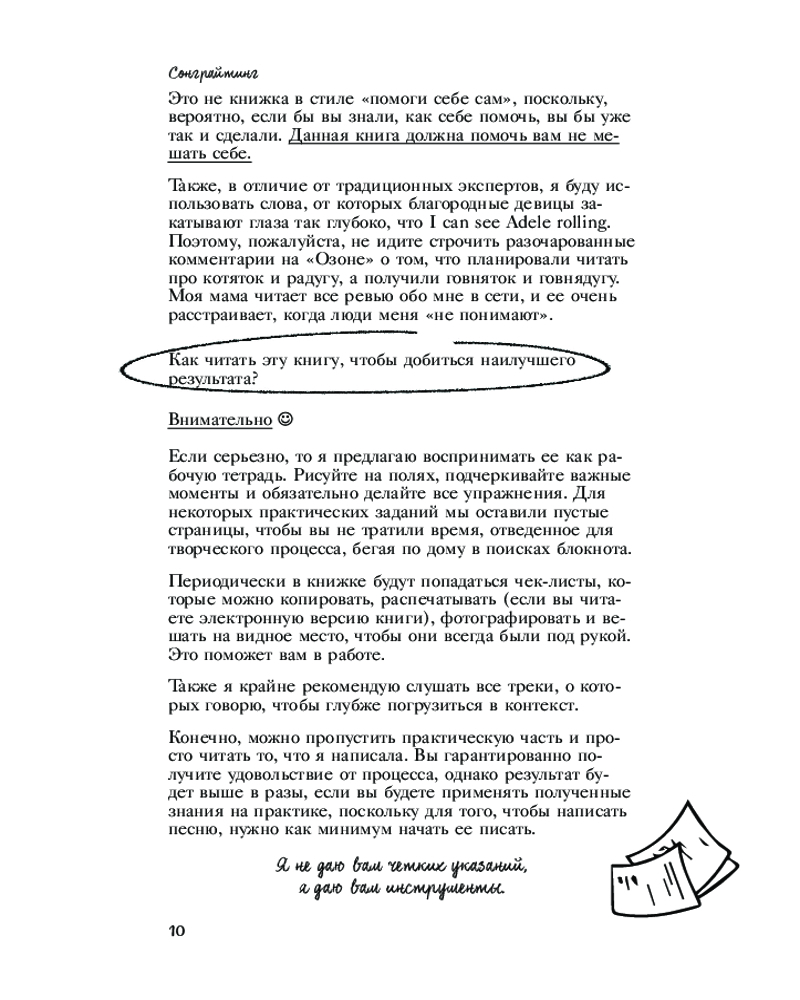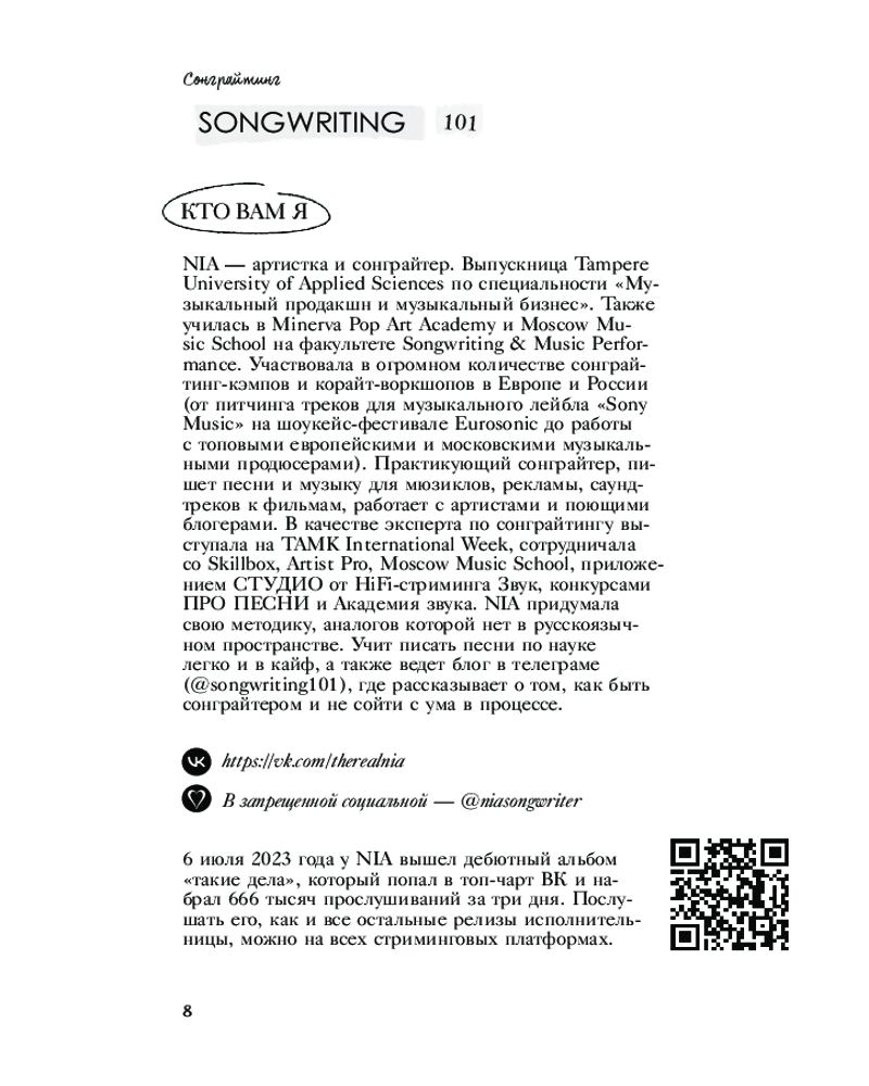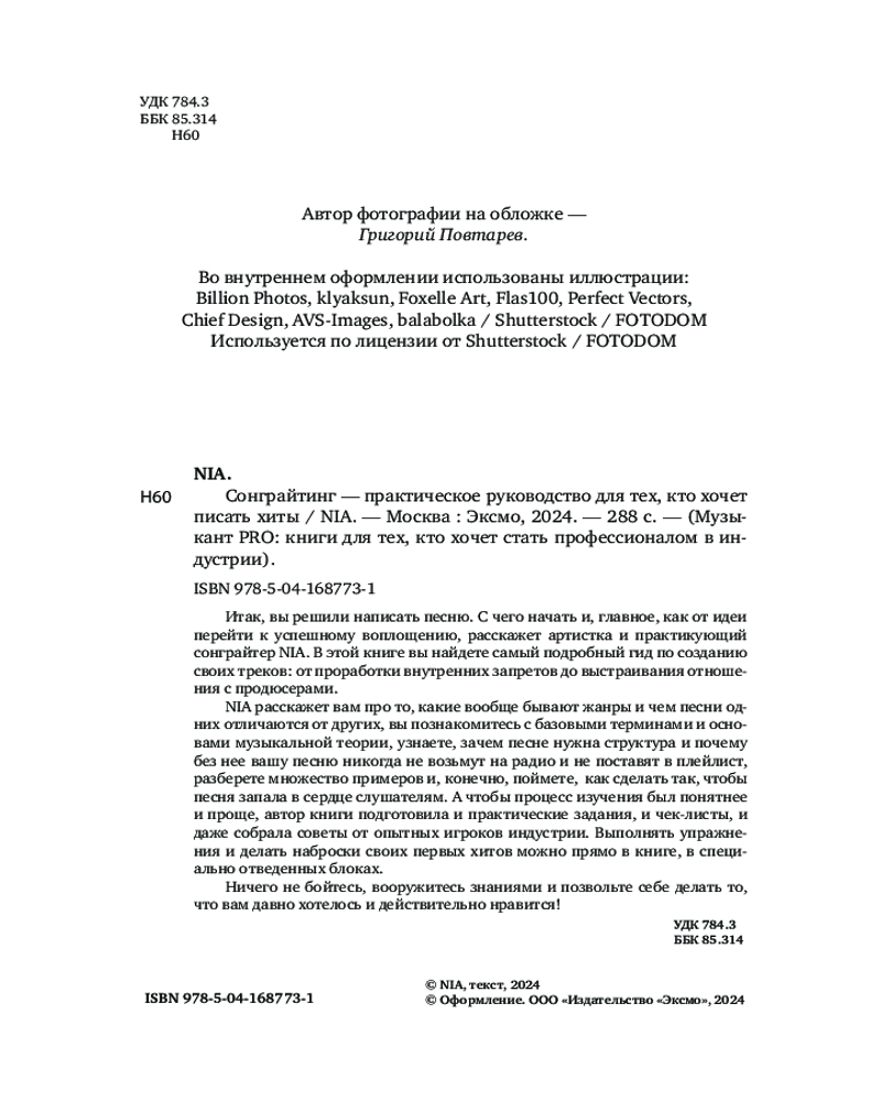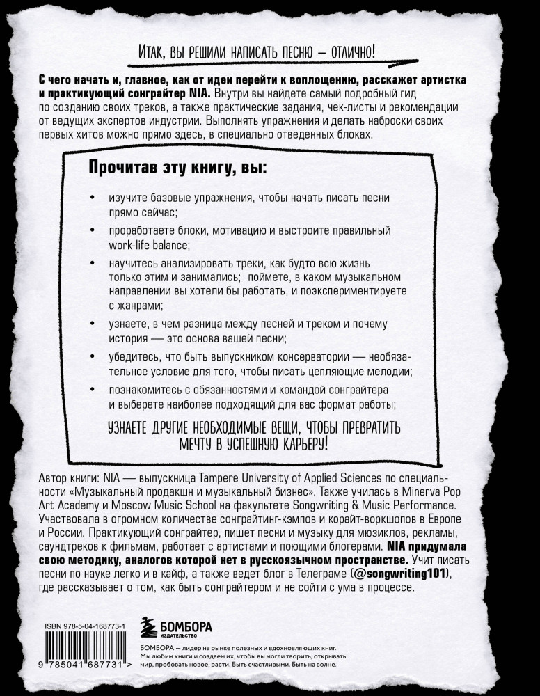 Серия: Музыкант PRO: книги для тех, кто хочет стать профессионалом в индустрии Итак, вы решили написать песню. С чего начать и, главное, как от идеи перейти к успешному воплощению, расскажет артистка и практикующий сонграйтер NIA. В этой книге вы найдете самый подробный гид по созданию своих треков: от проработки внутренних запретов до выстраивания отношения с продюсерами. NIA расскажет вам про то, какие вообще бывают жанры и чем песни одних отличаются от других, вы познакомитесь с базовыми терминами и основами музыкальной теории, узнаете, зачем песне нужна структура и почему без нее вашу песню никогда не возьмут на радио и не поставят в плейлист, разберете множество примеров и, конечно, поймете, как сделать так, чтобы песня запала в сердце слушателям. |