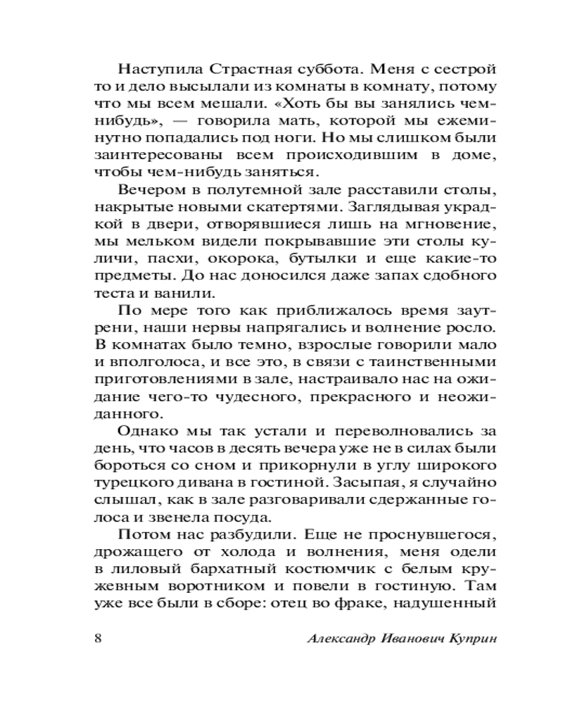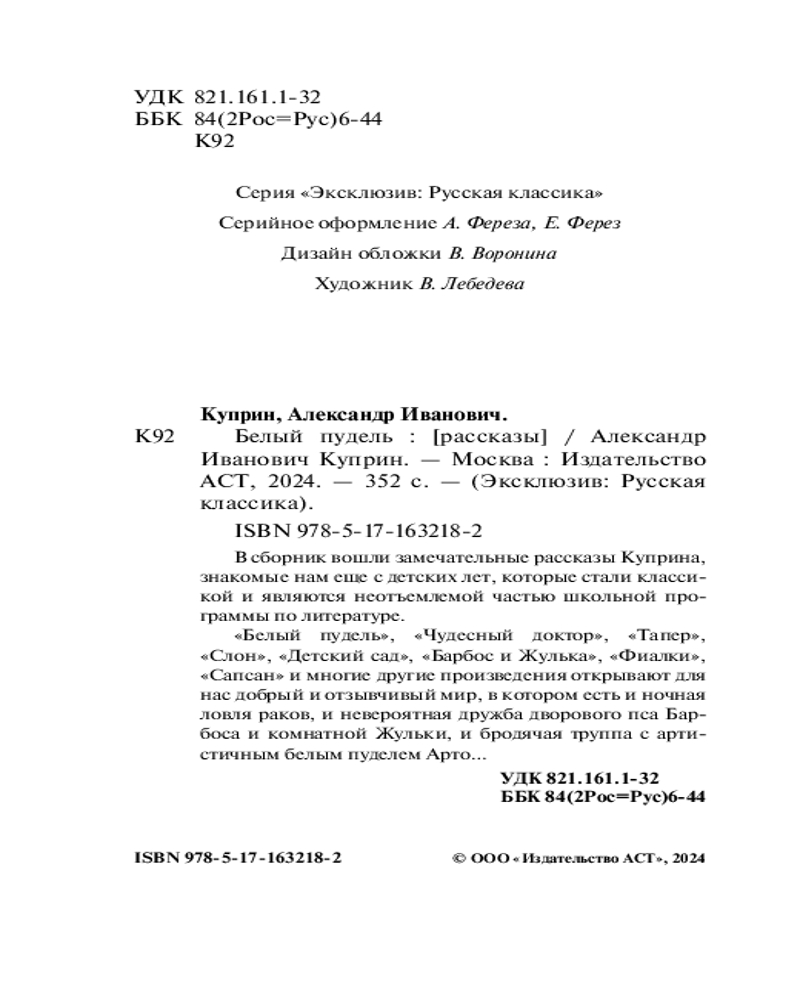 💳 Оплатить за товар можно при получении 🇰🇿 Есть бесплатная доставка по Казахстану 🎁 Копите бонусы с каждой покупки Серия: Эксклюзив: Русская классика В сборник вошли замечательные рассказы Куприна, знакомые нам еще с детских лет, которые стали классикой и являются неотъемлемой частью школьной программы по литературе. «Белый пудель», «Чудесный доктор», «Тапер», «Слон», «Детский сад», «Барбос и Жулька», «Фиалки», «Сапсан» и многие другие произведения открывают для нас добрый и отзывчивый мир, в котором есть и ночная ловля раков, и невероятная дружба дворового пса Барбоса и комнатной Жульки, и бродячая труппа с артистичным белым пуделем Арто... |