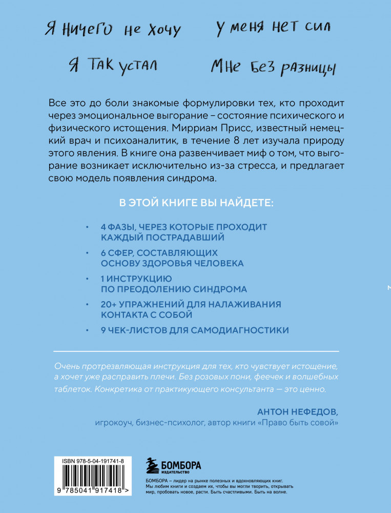 💳 Оплатить за товар можно при получении 🇰🇿 Есть бесплатная доставка по Казахстану 🎁 Копите бонусы с каждой покупки Серия: Работа над собой. Книги сильных психологов «Я ничего не хочу», «У меня нет сил», «Я так устал», «Мне без разницы» — всё это до боли знакомые формулировки тех, кто проходит через эмоциональное выгорание — состояние психического и физического истощения. Мириам Присс, известный немецкий врач и психоаналитик, в течение 8 лет изучала природу этого явления. В этой книге она развенчивает миф о том, что выгорание возникает исключительно из-за стресса, и предлагает свою модель появления синдрома. |