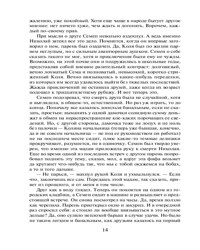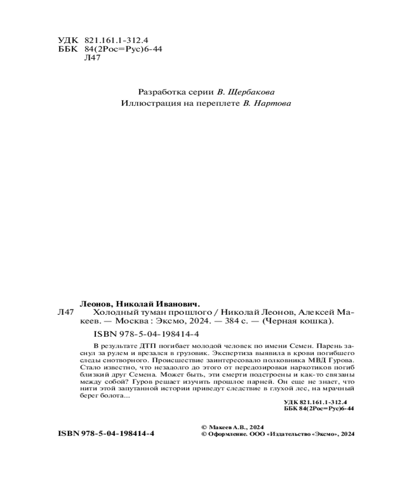 Холодный туман прошлогоАлексей Викторович Макеев, Николай Иванович Леонов В данный момент этот товар отсутствует в продаже. Возможно, у нас найдется аналогичный или похожий товар здесь. Серия: Черная кошка В результате ДТП погибает молодой человек по имени Семен. Парень заснул за рулем и врезался в грузовик. Экспертиза выявила в крови погибшего следы снотворного. Происшествие заинтересовало полковника МВД Гурова. Стало известно, что незадолго до этого от передозировки наркотиков погиб близкий друг Семена. Может быть, эти смерти подстроены и как-то связаны между собой? Гуров решает изучить прошлое парней. Он еще не знает, что нити этой запутанной истории приведут следствие в глухой лес, на мрачный берег болота... |