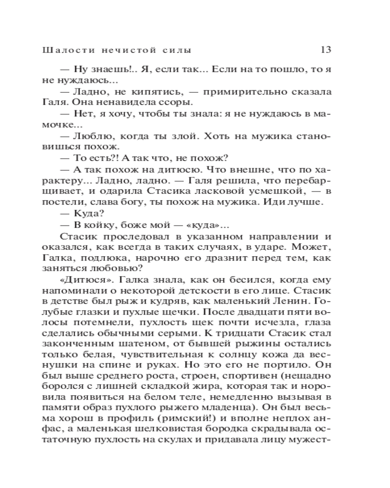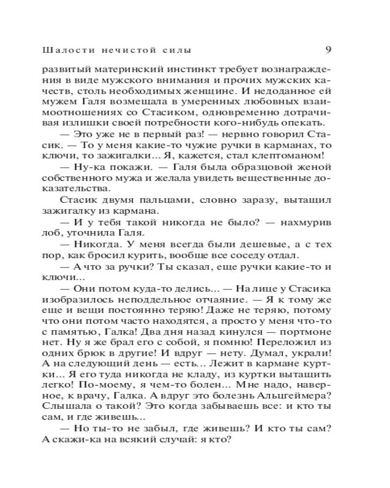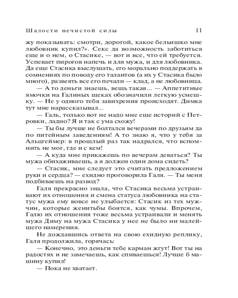 Шалости нечистой силыТатьяна Владимировна Гармаш-Роффе В данный момент этот товар отсутствует в продаже. Возможно, у нас найдется аналогичный или похожий товар здесь. Серия: Искусство детектива. Романы Т. Гармаш-Роффе. Новое оформление (обложка) На этот раз частному детективу Алексею Кисанову предстоит нелегкая работа... Его новый клиент Стасик рассказывает про себя невероятные вещи. То он проснулся... на крыше. То в его отсутствие в квартире кто-то переставил мебель. А один раз среди ночи оказался на кладбище, а вокруг него кружили дьявольский танец вампиры. Неужели он сходит с ума... А, может быть, это происки нечистой силы?! Стасик именно так и думал, пока не увидел свой фоторобот со стенда «Их разыскивает милиция»... Алексей Кисанов с интересом берется за дело. Ведь именно в то время, когда со Стасом шалила нечистая сила, в городе прокатилась волна групповых изнасилований, повлекшая за собой череду смертей... |