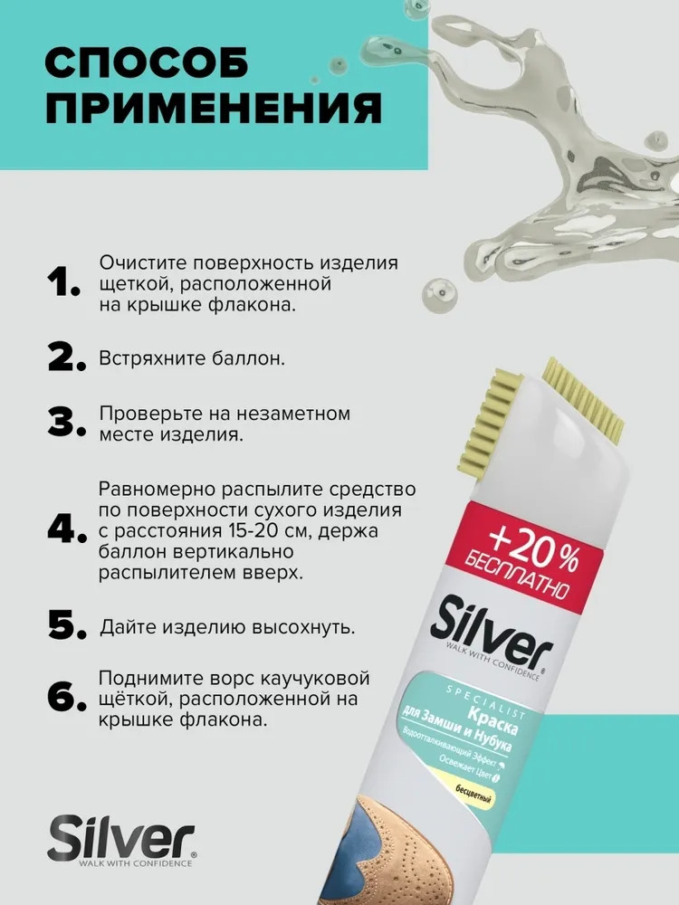Способ применения: очистите поверхность изделия щеткой расположенной на крышке флакона. Встряхните баллон. Равномерно распылите средство по поверхности сухого изделия с расстояния 15-20 см, держа баллон вертикально распылителем вверх, дайте высохнуть. Поднимите ворс каучуковой щеткой, расположенной на крышке флакона.