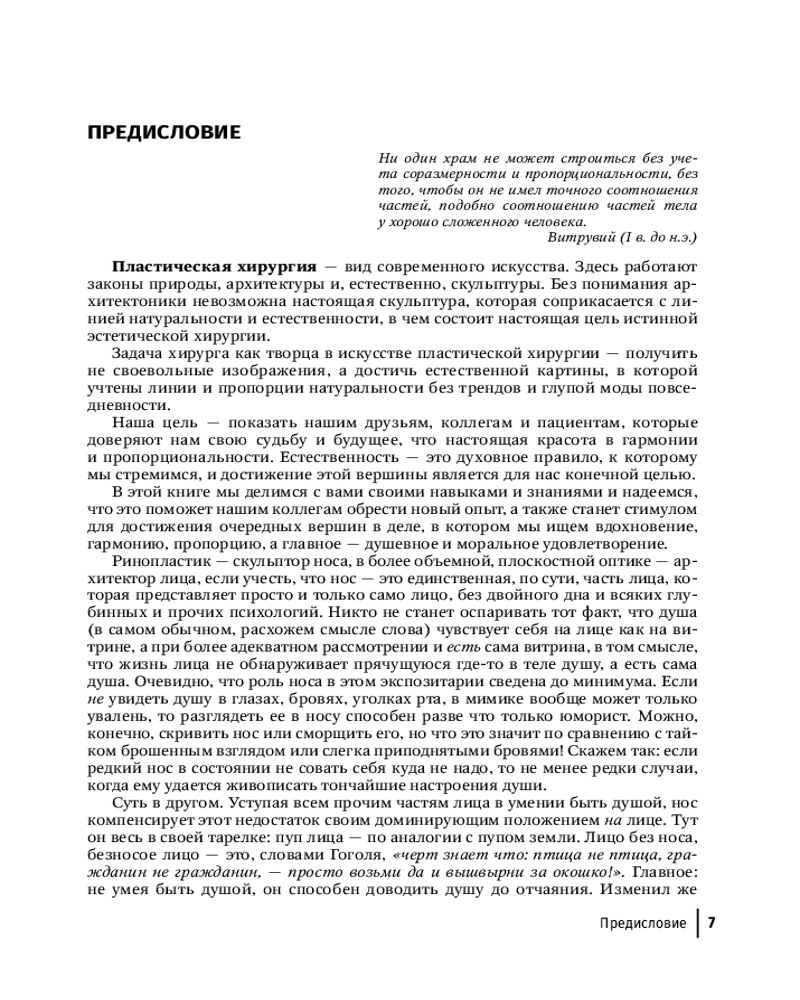 В книге представлены данные гистоморфологической оценки тканевых слоев поверхностной носовой оболочки. В частности, уточнены уровни расположения подкожно-жирового и мышечно-фасциального слоев, определены синтопические взаимоотношения между составными структурами поверхностной носовой оболочки, что имеет существенное значение для профилактики формирования неконтролируемого рубцевания данной области после проведенной эстетической хирургии носа. Описаны прогностические факторы для повторной эстетической хирургии носа и влияние девиации перегородки носа на структуры наружного носа. Предложен оригинальный алгоритм ведения пациентов, претендующих на хирургию носа по эстетическим показаниям, позволяющий определить и устранить сопутствующую функционально значимую внутриносовую патологию. |