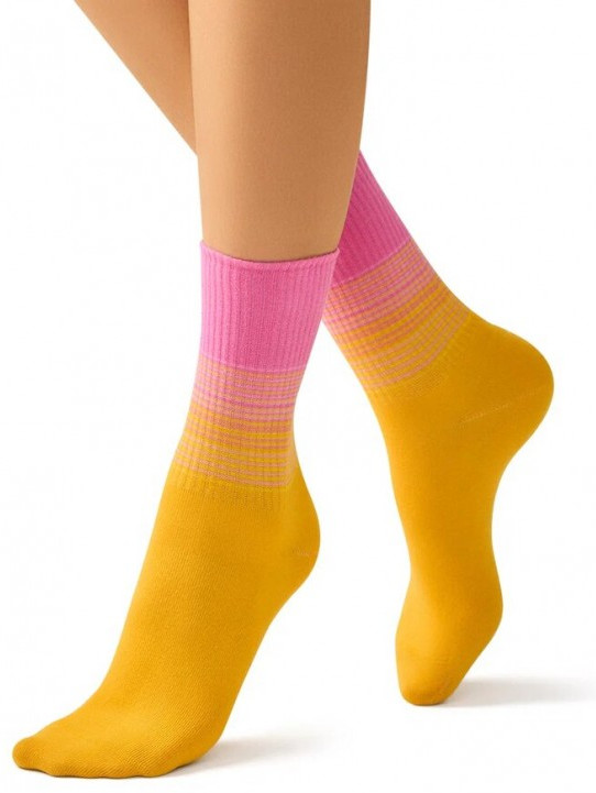 Женские высокие носки с красочным градиентом на резинке. В составе – высококачественный хлопок, который отлично пропускает воздух, впитывает влагу, и подходит даже для чувствительной кожи. Добавление эластана обеспечивает превосходное облегание. Удобная широкая резинка и кеттельный (плоский) шов на мыске создают дополнительный комфорт. Эффектный цветной градиент в сочетании с высокой резинкой создает модный и оригинальный акцент в образе. Такой аксессуар будет привлекать внимание, и сделает аутфит более самобытным.