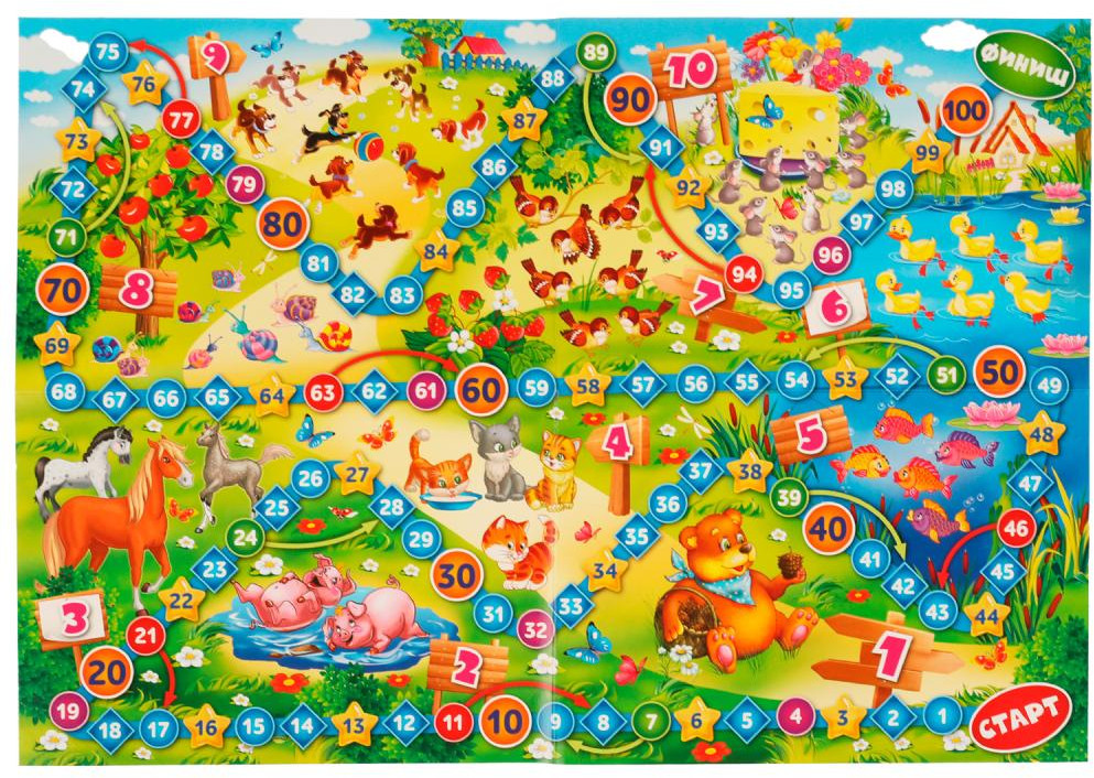 Игровое поле представляет собой красочную и детализированную иллюстрацию с дорожкой из геометрических фигур с числами. Старт в виде красного овала показывается начало дорожки, а зелёный овал — финиш.