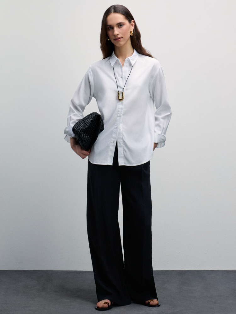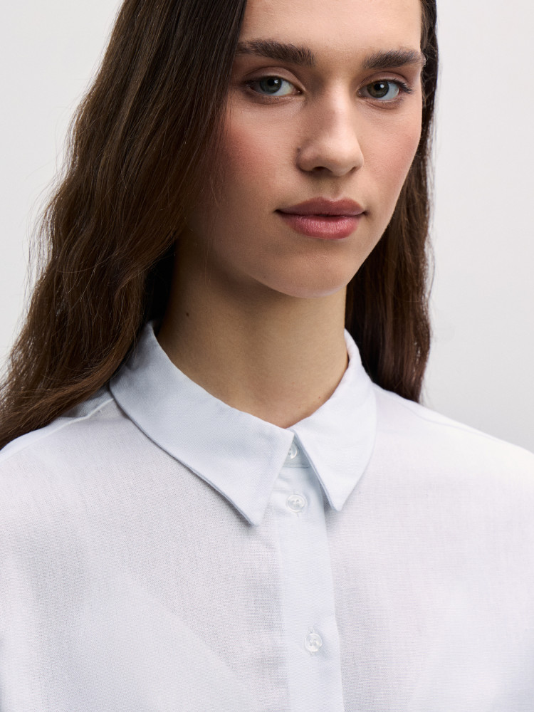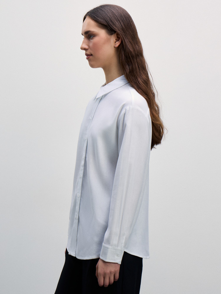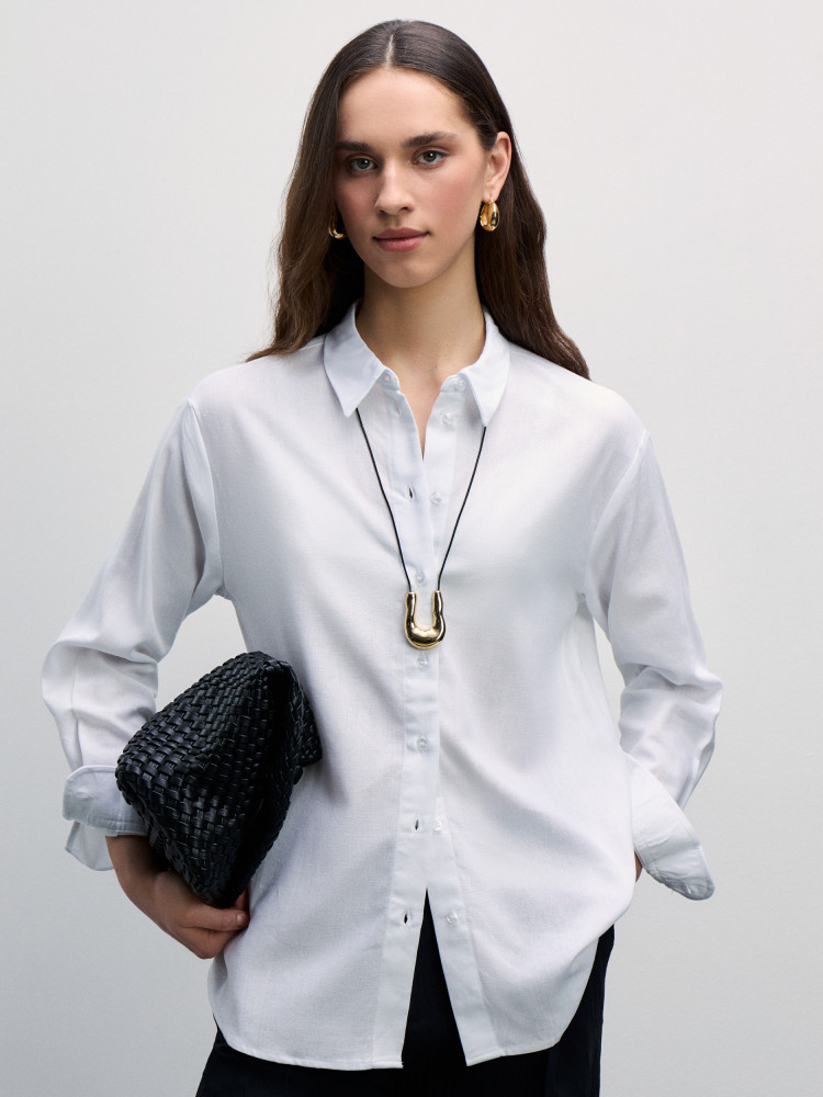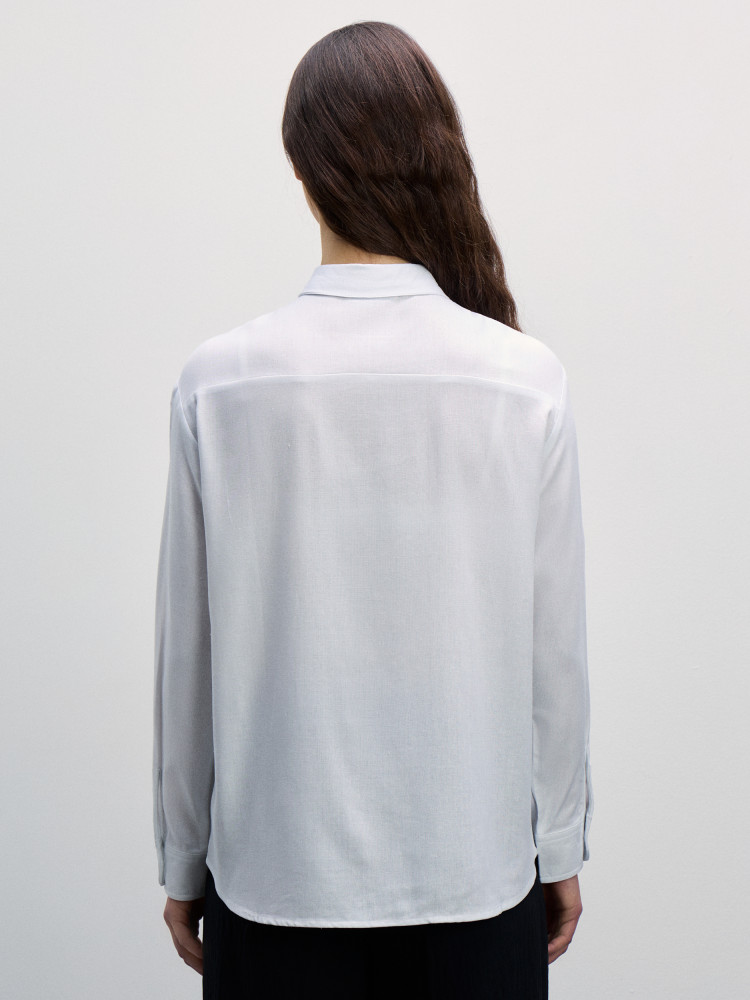 Лёгкая рубашка свободного кроя. Классический отложной воротник, рукав длинный. Такая рубашка подойдёт для создания стильного образа и будет гармонично смотреться в сочетаниях с брюками и юбками.