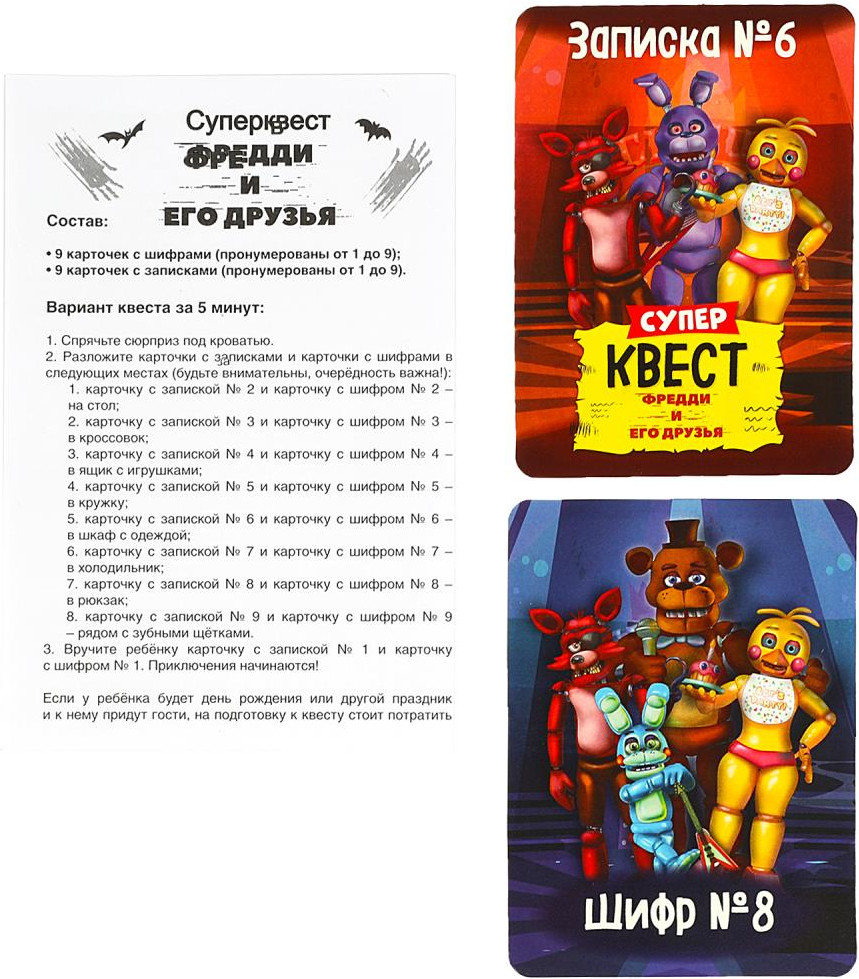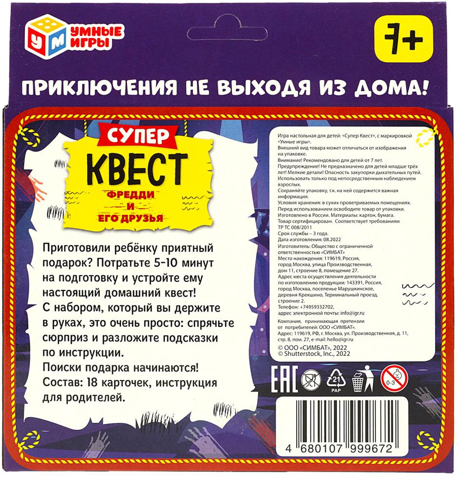 Умные игры Игра карточная «Фредди и его друзья»В данный момент этот товар отсутствует в продаже. Возможно, у нас найдется аналогичный или похожий товар здесь. Серия: Супер квест Карточная игра «Фредди и его друзья» ТМ «Умные игры» поможет удивить ребёнка приятным сюрпризом! Подготовили ребёнку приятный сюрприз и не знаете, как вручить подарок так, чтобы он запомнился надолго? Всего 5-10 минут на подготовку, и маленький непоседа сможет совершить увлекательное путешествие вместе с мишкой Фредди и его друзьями! В ходе этого путешествия ребёнку предстоит решить занимательные головоломки и ребусы, следуя от подсказки к подсказке. Всё, что нужно сделать перед этим, это разложить подсказки согласно инструкции и вручить тайное послание! |