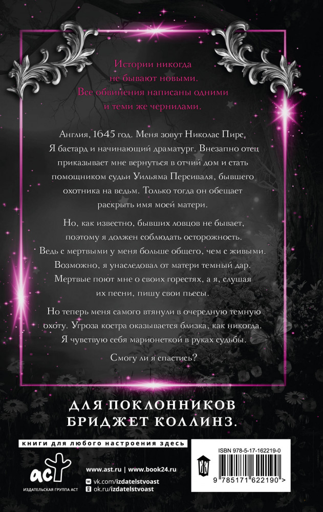 Серия: Total black: новый темный роман Истории никогда не бывают новыми. Все обвинения написаны одними и теми же чернилами. Англия, 1645 год. Меня зовут Николас Пирс. Я бастард и начинающий драматург. Внезапно отец приказывает мне вернуться в отчий дом и стать помощником судьи Уильяма Персиваля, бывшего охотника на ведьм. Только тогда он обещает раскрыть имя моей матери. |