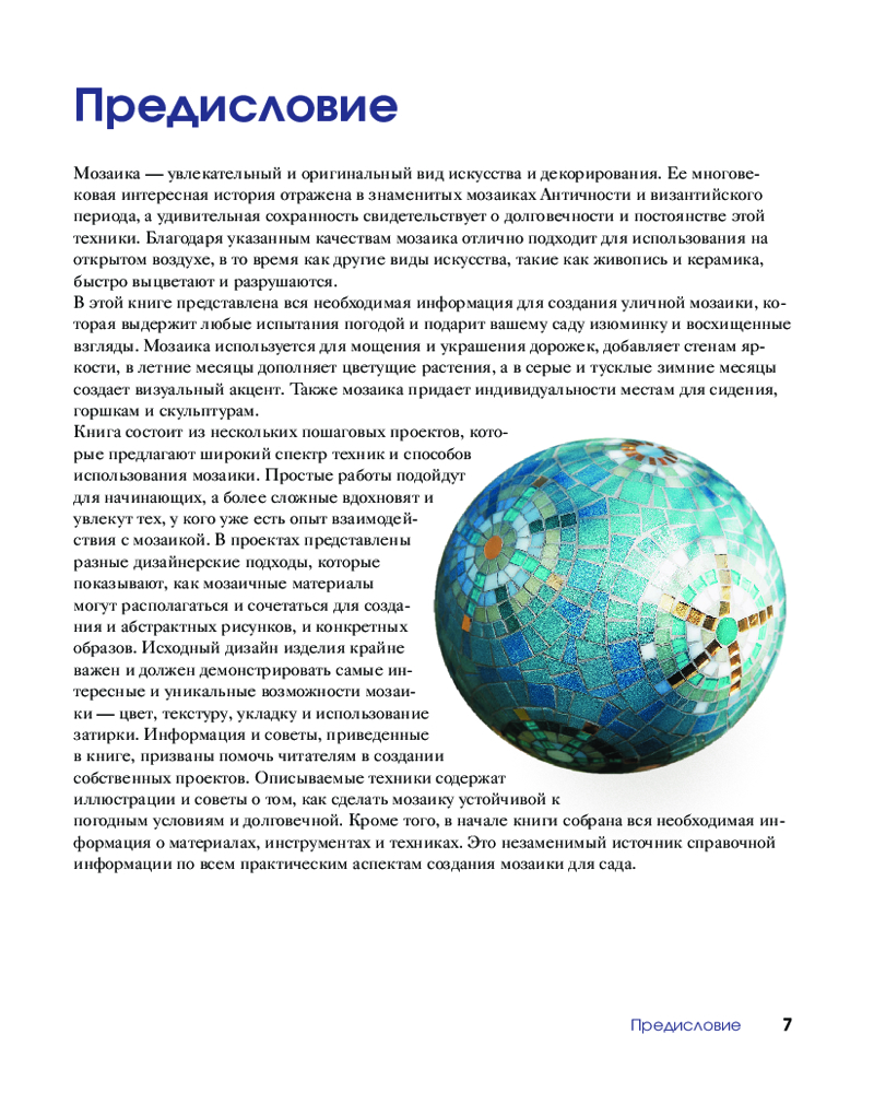 Серия: Подарочные издания. Лучшие идеи для дома и сада Мозаика придает индивидуальность декору: украшению дорожек в саду, горшкам, скульптурам, местам для сидения. Придает стенам яркости, летом дополняет цветущие растения, а в тусклые зимние месяцы создает визуальный акцент. Она долговечна, поэтому хорошо подходит для создания дизайна на открытом воздухе. Хотите своими руками создать яркий, красивый мозаичный проект в вашем саду, который будет радовать вас долгие годы? Эта книга вам поможет!