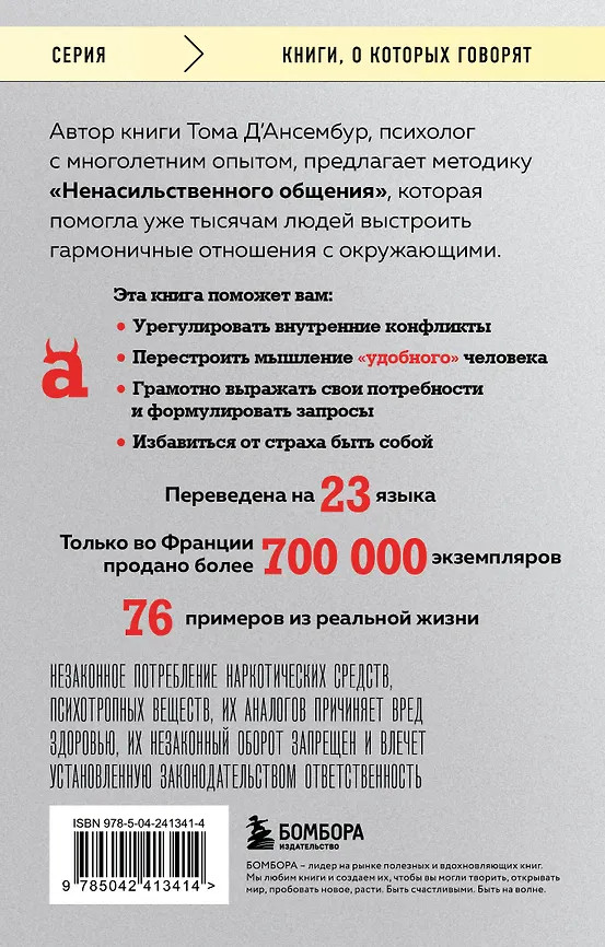 💳 Оплатить за товар можно при получении 🇰🇿 Есть бесплатная доставка по Казахстану от 1 дня 🎁 Копите бонусы с каждой покупки Серия: Книги, о которых говорят Если признаться себе в своих истинных желаниях, то можно избежать массы проблем в общении с окружающими. На этом утверждении основана уникальная методика «Ненасильственного общения», которая уже помогла тысячам супружеских пар, офисных сотрудников, родителей трудных подростков и самих подростков выстроить гармоничные отношения с другими людьми. Эта книга – настоящий учебник по тому, как без конфликтов, лести и самопожертвования всегда добиваться своего, оставаясь верным себе и своим потребностям. |