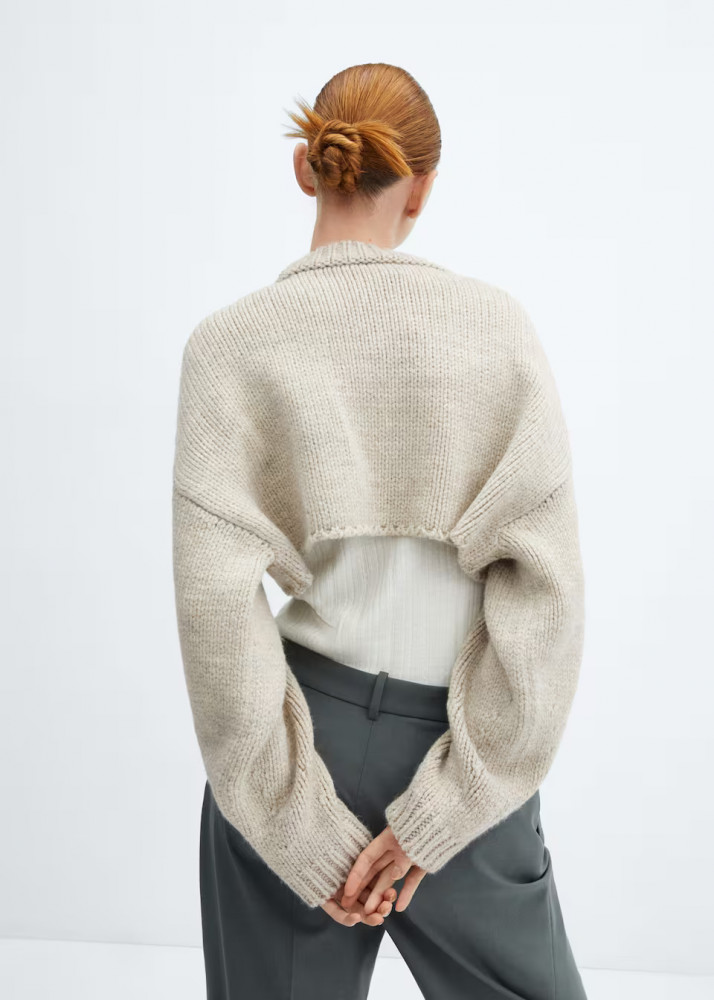 Пряжа крупная и местами нарочито небрежная. Для меня классно. Даже летом в прохладную погоду уютно. Цвет теплый серо бежевый. Рукава длинные, снизу не облегает.