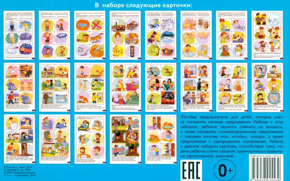 Играй и говори! Сложные предложенияВ данный момент этот товар отсутствует в продаже. Возможно, у нас найдется аналогичный или похожий товар здесь. Пособие предназначено для детей, которые учатся составлять связные предложения. Работая с этим набором, ребенок научится отвечать на вопросы, а также составлять сложноподчиненные предложения с союзами «потому что», «чтобы», «когда», а также предложения с однородными сказуемыми. Работа с данным набором карточек, способствует тому, что речь ребенка станет связной, грамматически правильно оформленной, красивой. В брошюре 21 карточка. |