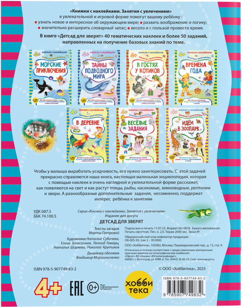 Серия: Книжки с наклейками. Занятия с увлечением В увлекательной и игровой форме наша книга поможет вашему ребёнку узнать новое и интересное об окружающем мире, развить воображение и логику, расширить словарный запас, весело и с пользой провести время. В книге 40 тематических наклеек и более 50 заданий (загадки, раскраски, игры на внимание и логику), направленных на получение базовых знаний по теме. Чтобы у малыша выработать усидчивость, его нужно заинтересовать. С этой задачей прекрасно справляется наша книга, настоящая маленькая энциклопедия, которая с помощью наклеек в очень наглядной и увлекательной форме расскажет, как появляются на свет и как растут птицы, рыбы, насекомые, земноводные, рептилии и другие зверята. А разнообразные дополнительные задания, несомненно, поддержат интерес ребёнка к занятиям с книжкой. |