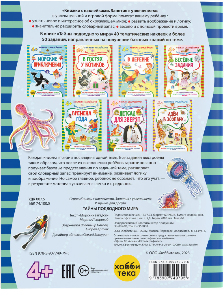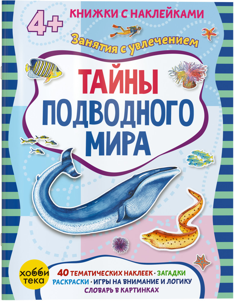 Серия: Книжки с наклейками. Занятия с увлечением В увлекательной и игровой форме наша книга поможет вашему ребёнку узнать новое и интересное об окружающем мире, развить воображение и логику, расширить словарный запас, весело и с пользой провести время. В книге 40 тематических наклеек и более 50 заданий (загадки, раскраски, игры на внимание и логику, словарик в картинках), направленных на получение базовых знаний по теме. Чтобы у малыша выработать усидчивость, его нужно заинтересовать. С этой задачей прекрасно справляется наша книга, настоящая маленькая энциклопедия, которая с помощью наклеек в очень наглядной и увлекательной форме расскажет загадках и тайнах морей и океанов, о затонувших кораблях, об обытателях подводных глубин, о кораловых рифах, о медузах и синих китах, о битвах под водой. А разнообразные дополнительные задания, несомненно, поддержат интерес ребёнка к занятиям с книжкой. |