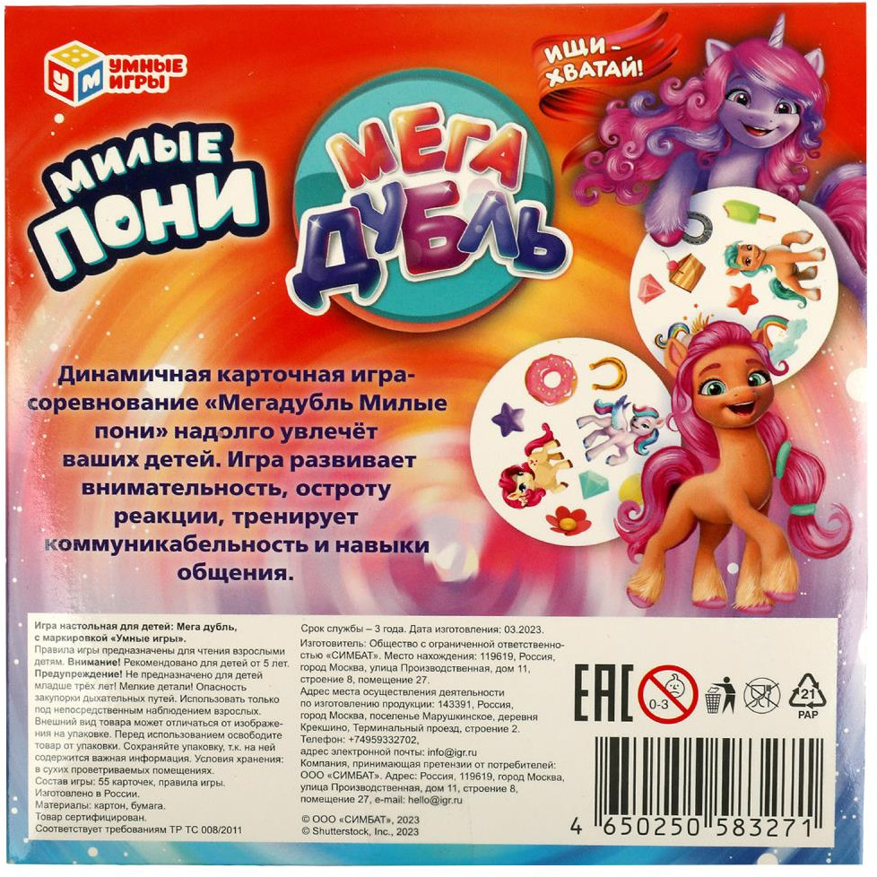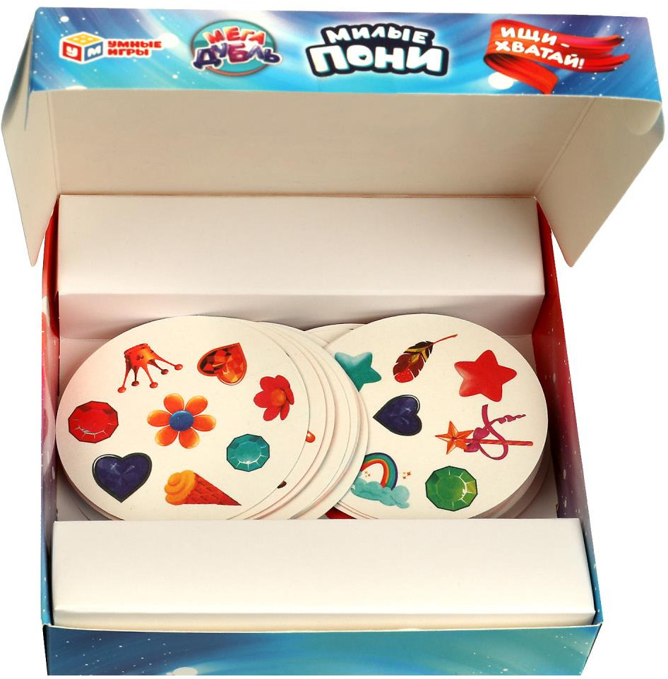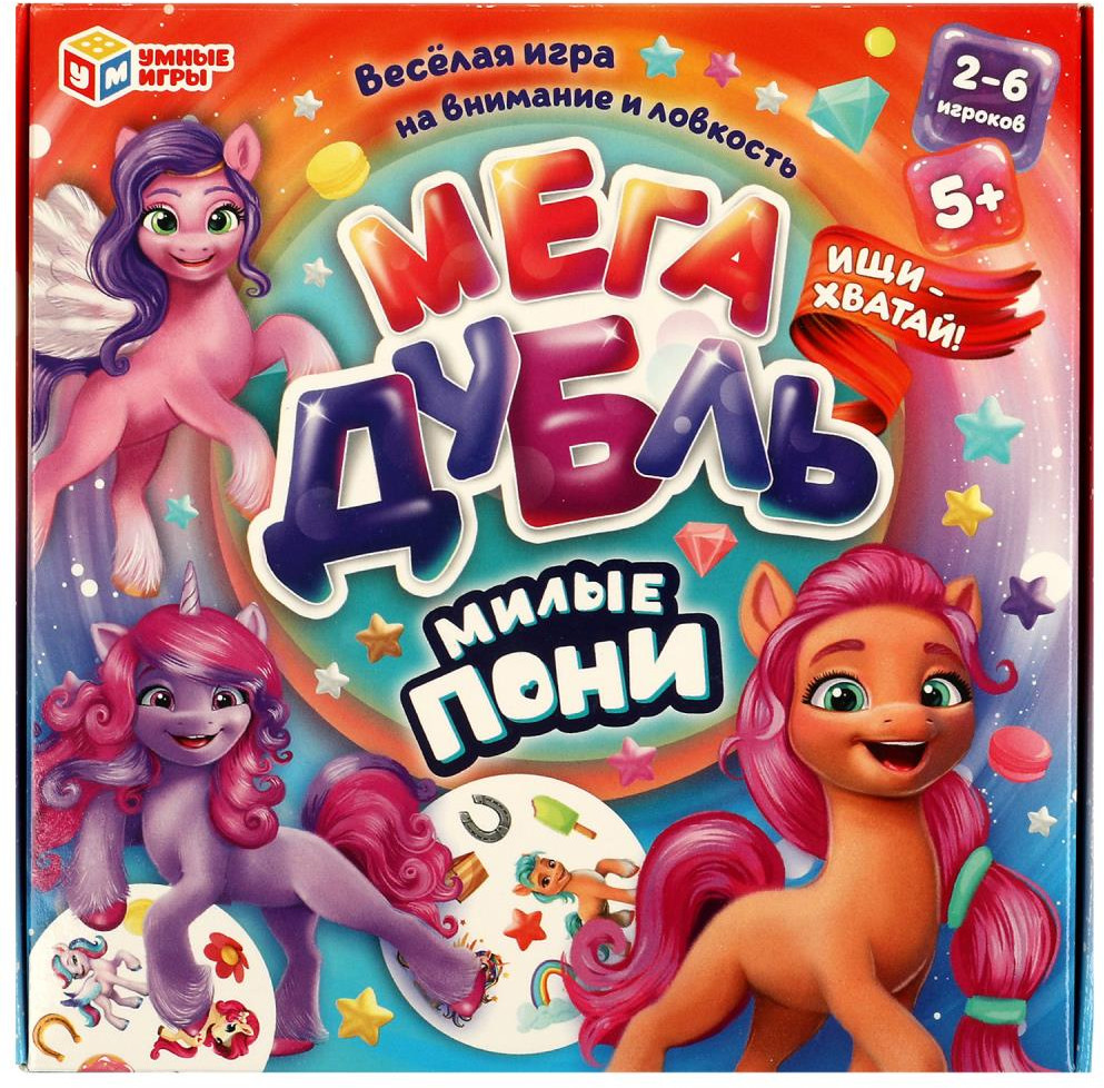 Серия: Милые пони Карточная игра «МегаДубль. Милые пони» ТМ «Умные игры» — весёлая игра на внимание и ловкость. Эта динамичная игра-соревнование надолго увлечёт маленьких любознаек. Можно выбрать любую игру из предложенных пяти вариантов, суть их всех сводится к одному — отыскать быстрее всех картинку-совпадение на своей карточке и карточке, указанной в правилах той или иной вариации игры. |