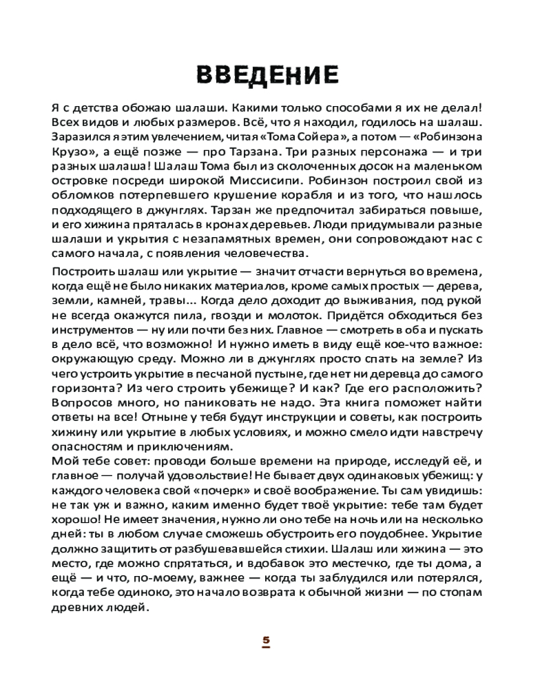 Автор книги — Максим Бертон, опытный искатель приключений и профессионал в области выживания. Он подготовил для вас 22 инструкции, которые помогут построить самые разные укрытия: от квинжи (чтобы спрятаться от снегопада) и хижины Робинзона (защитит от палящего солнца) до настоящего домика на дереве. В книге вы найдёте основные техники строительства и узнаете, какие материалы и инструменты вам понадобятся для вашего убежища.