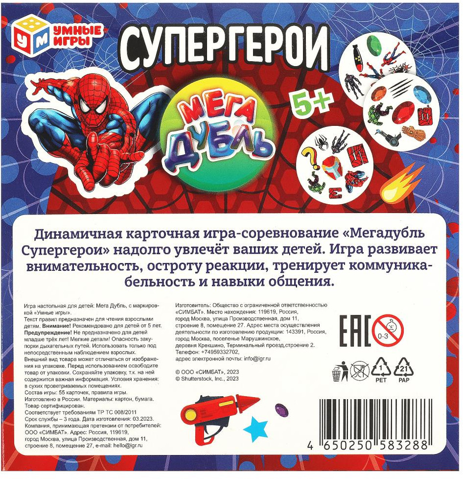 Серия: Мега дубль Карточная игра «МегаДубль. Супергерои» ТМ «Умные игры» — весёлая игра на внимание и ловкость. Эта динамичная игра-соревнование надолго увлечёт маленьких любознаек. Можно выбрать любую игру из предложенных пяти вариантов, суть их всех сводится к одному — отыскать быстрее всех картинку-совпадение на своей карточке и карточке, указанной в правилах той или иной вариации игры. |