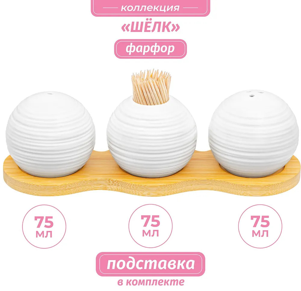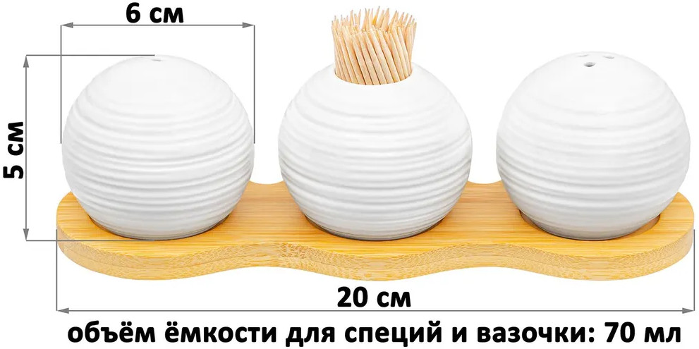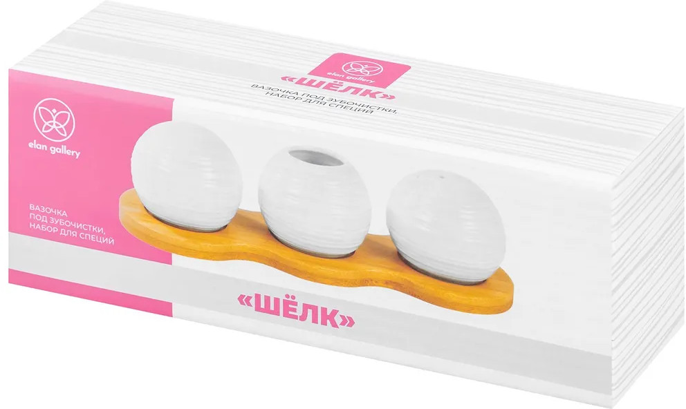 Серия: Шелк Набор для специй Elan Gallery «Шелк» с вазочкой под зубочистки на бамбуковой подставке выполнен из фарфора. Общий размер набора — 20 × 6.5 × 6 см. В комплект входят: вазочка под зубочистки, солонка и перечница. Размер каждой круглой фигурки — 6 × 6 × 5 см, объём — 75 мл. Зубочистки поставляются в комплекте. Ёмкости для соли и перца украсят обеденный стол в будни и подойдут для красивой сервировки праздничного стола. Столовые принадлежности можно использовать для хранения соли, перца или приправ. Они позволят держать всё необходимое под рукой в процессе приготовления еды. Баночки выполнены из белого фарфора, который отличается от керамики повышенной плотностью. Фарфоровые контейнеры не впитывают цвет и не деформируются от влаги, чему может быть подвержена керамика. Фигурки наполняются через отверстия внизу, которые закрываются пластиковыми пробками. Настольный набор поставляется в стильной картонной упаковке. Красивый кухонный инвентарь оценит любая хозяйка. Декоративный набор для специй станет украшением вашей кухни или приятным подарком на Восьмое марта, Пасху, День Рождения и любой другой праздник. Создайте на вашей кухне атмосферу уюта благодаря красивой посуде для сервировки из фарфора! |