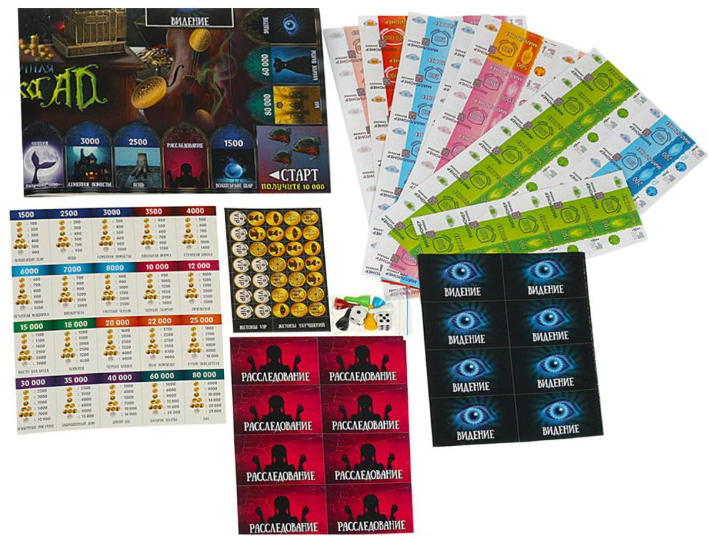 • игровые бумажные деньги номиналом 100, 200, 500, 1000, 2000, 5000, 20000;