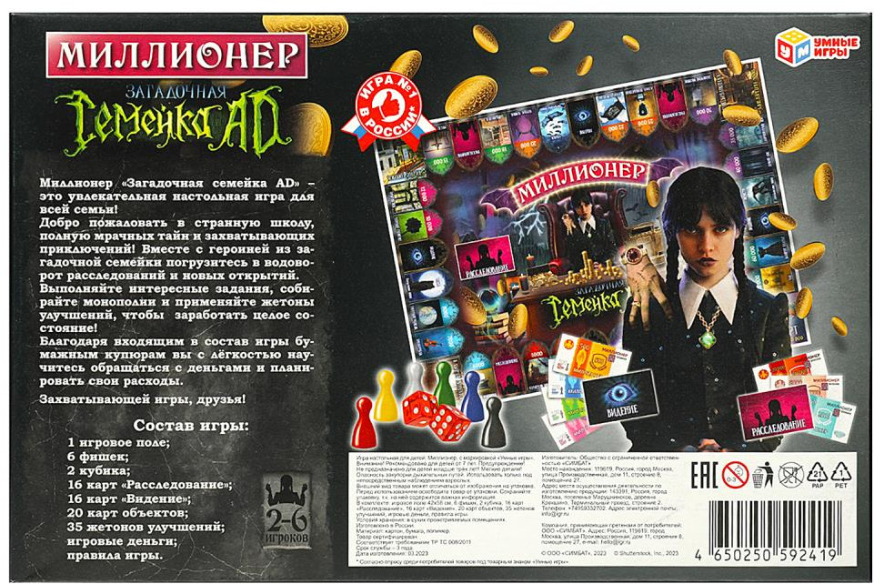 Серия: Миллионер Настольная бизнес-игра «Загадочная семейка AD» ТМ «Умные игры» – увлекательная экономическая игра, которая увлечёт и детей, и взрослых. Эта игра поможет в игровой форме преподнести ребёнку основы экономических знаний и обучить его счёту. На её примере дети научаться обращаться с деньгами, вести расчёты и планировать свои расходы. И, конечно же, смогут повеселиться, играя вместе: покупайте объекты, делайте их улучшения. Продумайте свою стратегию победы и станьте самым богатым миллионером!