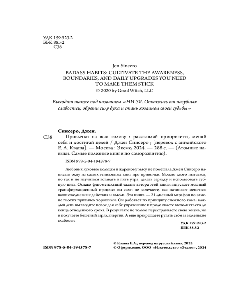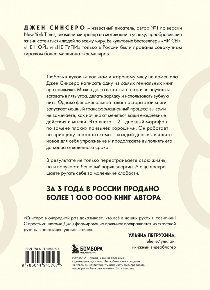 Серия: Атомные навыки. Самые полезные книги по саморзвитию Книги Джен Синсеро стали мировым феноменом. «НИ СЫ» вот уже более трех лет находится в ТОП-20 AMAZON. Тексты этого автора заряжены на трансформацию жизни: невозможно «просто прочитать» их, хочется сразу начать меняться. «НИ ЗЯ. Откажись от пагубных слабостей, обрети силу духа и стань хозяином своей судьбы» — это не просто очередная книга по саморазвитию. Она выделяется из общей массы своей самобытностью, подачей и неожиданными инсайтами. Книга рассказывает о том, как у нас формируются привычки, зачем они нужны и что вообще можно считать «привычкой». |