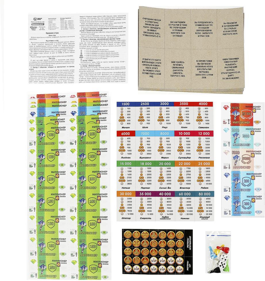 • игровые бумажные деньги номиналом 100, 200, 500, 1000, 2000, 5000, 20000;