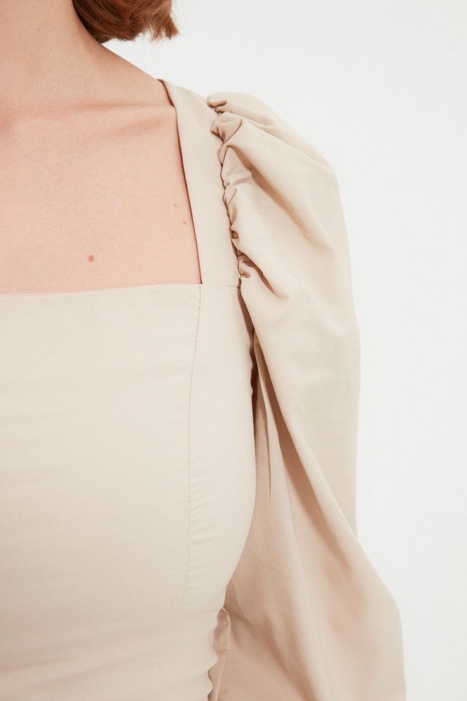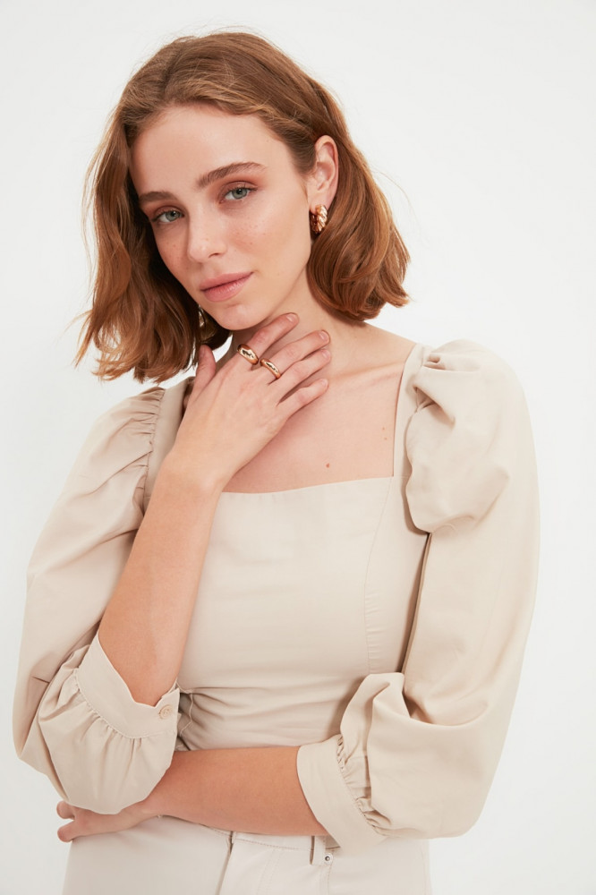 Одними из самых модных и стильных блузок сезона стали красивые блузки с рукавами-фонариками. Эта прилегающая женская блузка имеет идеальную посадку за счет рельефов по полочке. Эффектный вырез каре и рукава фонарики придают блузке романтичный стиль и женственность. Классические брюки, любимые джинсы, скинни, шорты, юбка-карандаш и другие фасоны юбки миди великолепно сочетаются с модной блузой, создавая нежные и очень женственные образы.