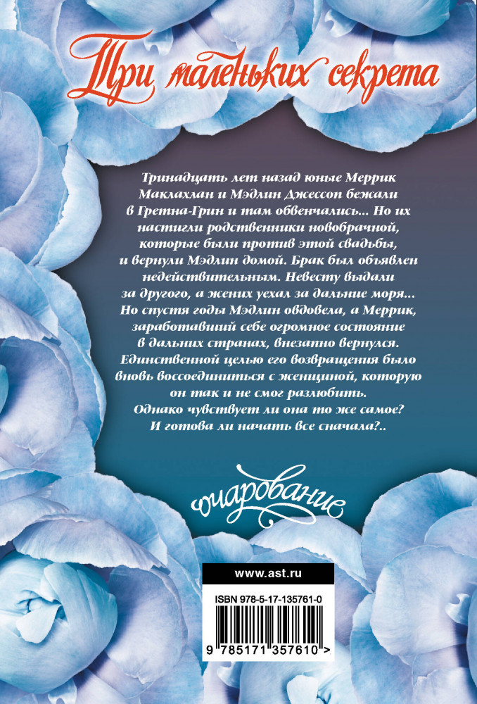 Три маленьких секретаВ данный момент этот товар отсутствует в продаже. Возможно, у нас найдется аналогичный или похожий товар здесь. Серия: Очарование (мини)! Тринадцать лет назад юные Меррик Маклахлан и Мэдлин Джессоп бежали в Гретна-Грин и там обвенчались... Но их настигли родственники новобрачной, которые были против этой свадьбы, и вернули Мэдлин домой. Брак был объявлен недействительным. Невесту выдали за другого, а жених уехал за дальние моря... Но спустя годы Мэдлин овдовела, а Меррик, заработавший себе огромное состояние в дальних странах, внезапно вернулся. Единственной целью его возвращения было вновь воссоединиться с женщиной, которую он так и не смог разлюбить. Однако чувствует ли она то же самое? И готова ли начать все сначала?... |