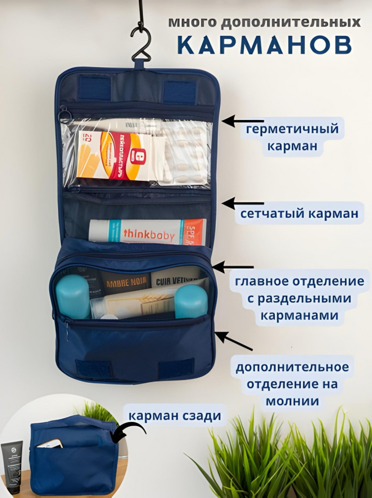 Выполнен из высококачественных и водоотталкивающих материалов. Внутри имеется большой отсек для хранения баночек, бутылочек , расчесок и т.д. , далее расположено отделение, которое выполнено из плотной сетчатой ткани и непромокаемый прозрачный отсек из клеенчатого материала. Все отделения закрываются при помощи удобной молнии и дополнительно на прочные липучки. Также, набор имеет специальный крючок для удобного подвесного хранения, благодаря которому очень удобно доставать предметы обихода. Дорожная сумка поможет организовать вещи во время поездки или командировки.
