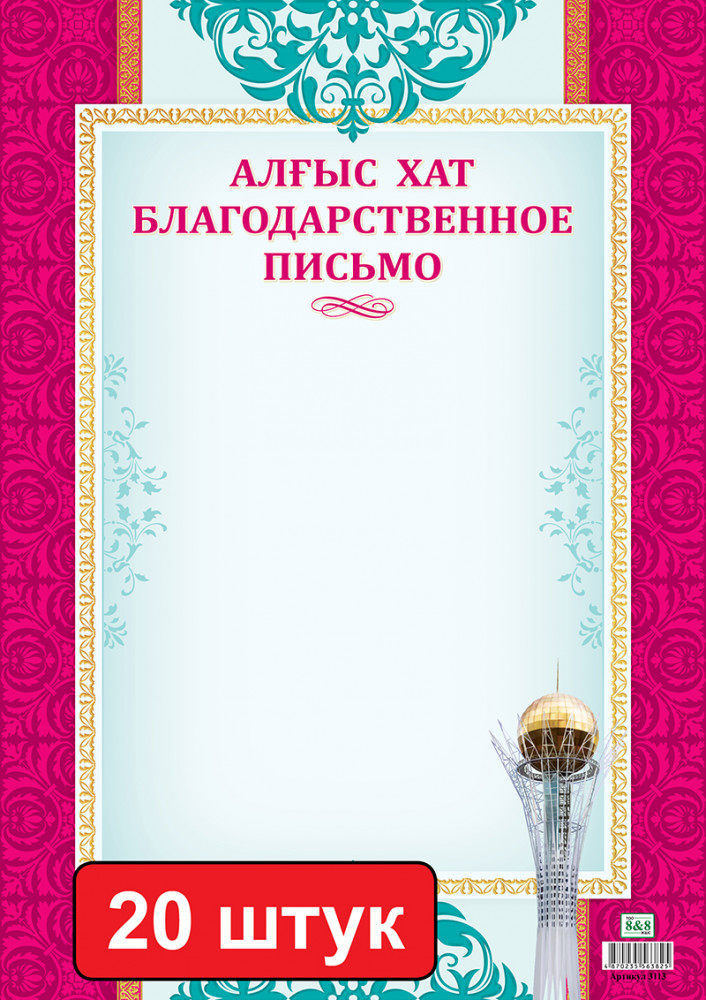 Бланк «Алғыс хат / Благодарственное письмо» используется для выражения признательности сотрудникам, коллегам, партнерам, учащимся. Бланк подходит для черно-белой и цветной печати. |