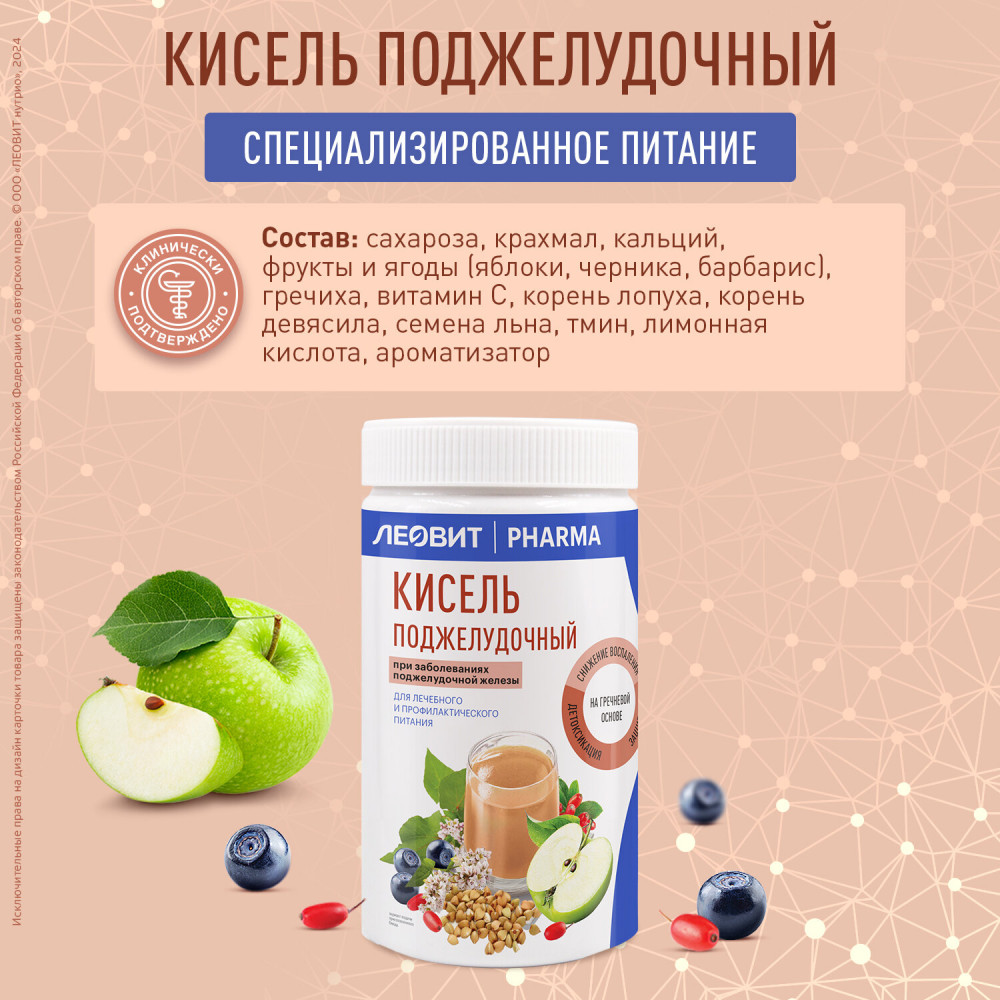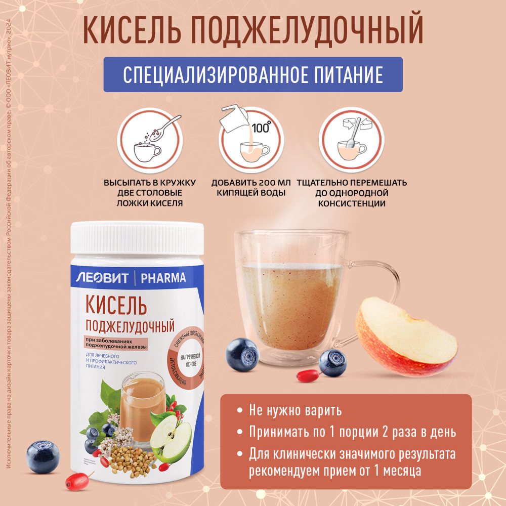 Кисель Поджелудочный это специализированный пищевой продукт диетического профилактического питания. Кисель леовит применяется в качестве диетотерапии в комплексной терапии при хронических заболеваниях поджелудочной железы в стадии обострения. Напиток оказывает благоприятное воздействие на функцию поджелудочной железы, способствуют уменьшению воспалительных процессов поджелудочной железы, снижает риск обострения хронического панкреатита и эффективен для коррекции питания при хроническом панкреатите. |