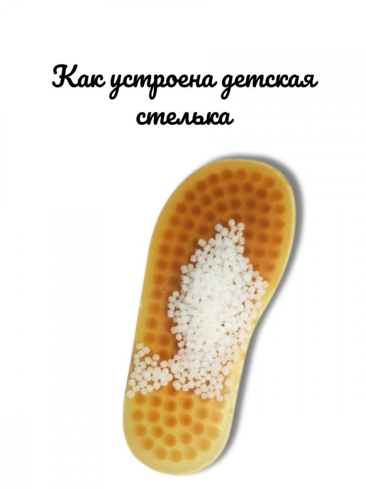Как устроена стелька анатомическая стелька: стелька в релаксах снабжена карманами, которые заполнены полимерными гранулами с учетом анатомии стопы. В детских релаксах с 25 по 30 размер гранулами заполняется только подсводный выступ для профилактики продольного и поперечного плоскостопия, в детских релаксах с 31 по 34 размер гранулами заполняются подсводный выступ, подпальцевый валик и подпяточная подушка. В взрослых релаксах с 35 по 46 размер гранулами заполняются подсводный выступ, подпальцевый валик, подпальцевое пространство и подпяточная подушка.