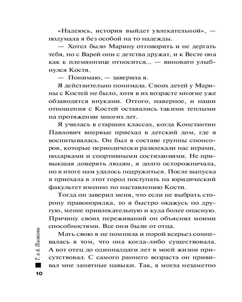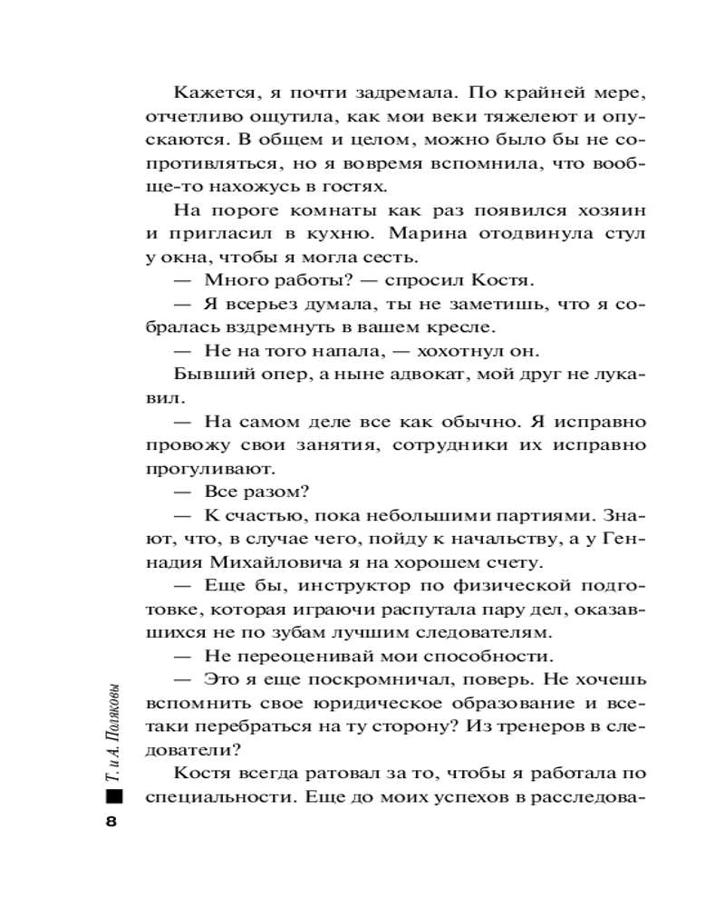 Серия: Детективы с авантюрой Татьяны и Анны Поляковых Маленькую Татьяну отец воспитывал так, будто готовил в суперагенты, но однажды родитель исчез, и девочка оказалась в детдоме. Повзрослев, Таня идет служить в полицию. Она инструктор по физподготовке, но всегда готова помочь коллегам вести расследование, даже если речь идет просто о пропаже ноутбука студентки. Правда, со временем Татьяна начинает подозревать, что именно исчезновение ноутбука запустило череду убийств, которые одно за одним происходят вокруг студентки. Нужно срочно его отыскать, чтобы остановить преступления. |