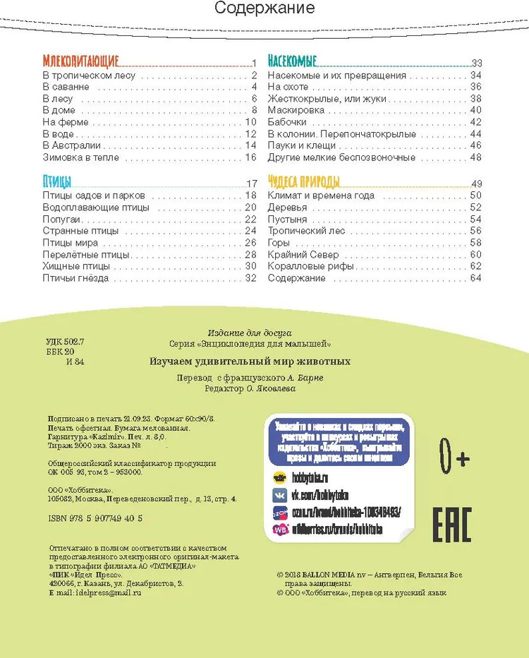 Изучаем удивительный мир животныхВ данный момент этот товар отсутствует в продаже. Возможно, у нас найдется аналогичный или похожий товар здесь. В этой книге собрано множество захватывающих фактов о чудесах природы, о млекопитающих, птицах, насекомых! Невозможно поверить, что: козы превосходно лазают по деревьям, у белого медведя чёрная кожа, утки спят с открытыми глазами, а у одного кролика может быть целых 800... Но не будем лишать тебя удовольствия прочитать обо всём этом самому! |