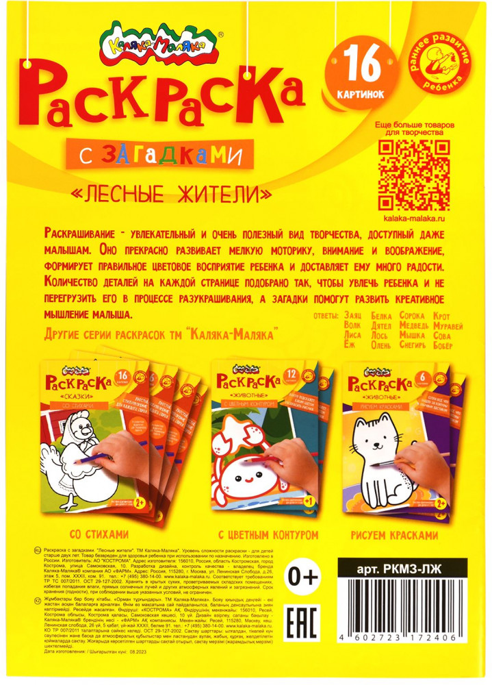 Каляка-Маляка Раскраска детская с загадками «Лесные животные»В данный момент этот товар отсутствует в продаже. Возможно, у нас найдется аналогичный или похожий товар здесь. Серия: Раскраска-малышка Раскраски предназначены для детей дошкольного возраста старше 2 лет. Уровень сложности картинок соответствует способностям ребенка от 2 лет. Интересные герои обязательно понравятся малышам и перенесут их в увлекательный мир творчества. Раскрашивание развивает фантазию, мелкую моторику и прекрасно влияет на психоэмоциональное состояние ребенка. Количество деталей на каждой странице подобрано так, чтобы не перегрузить его в процессе разукрашивания. Формат раскраски — А4, плотность листов 100 г/м2. |